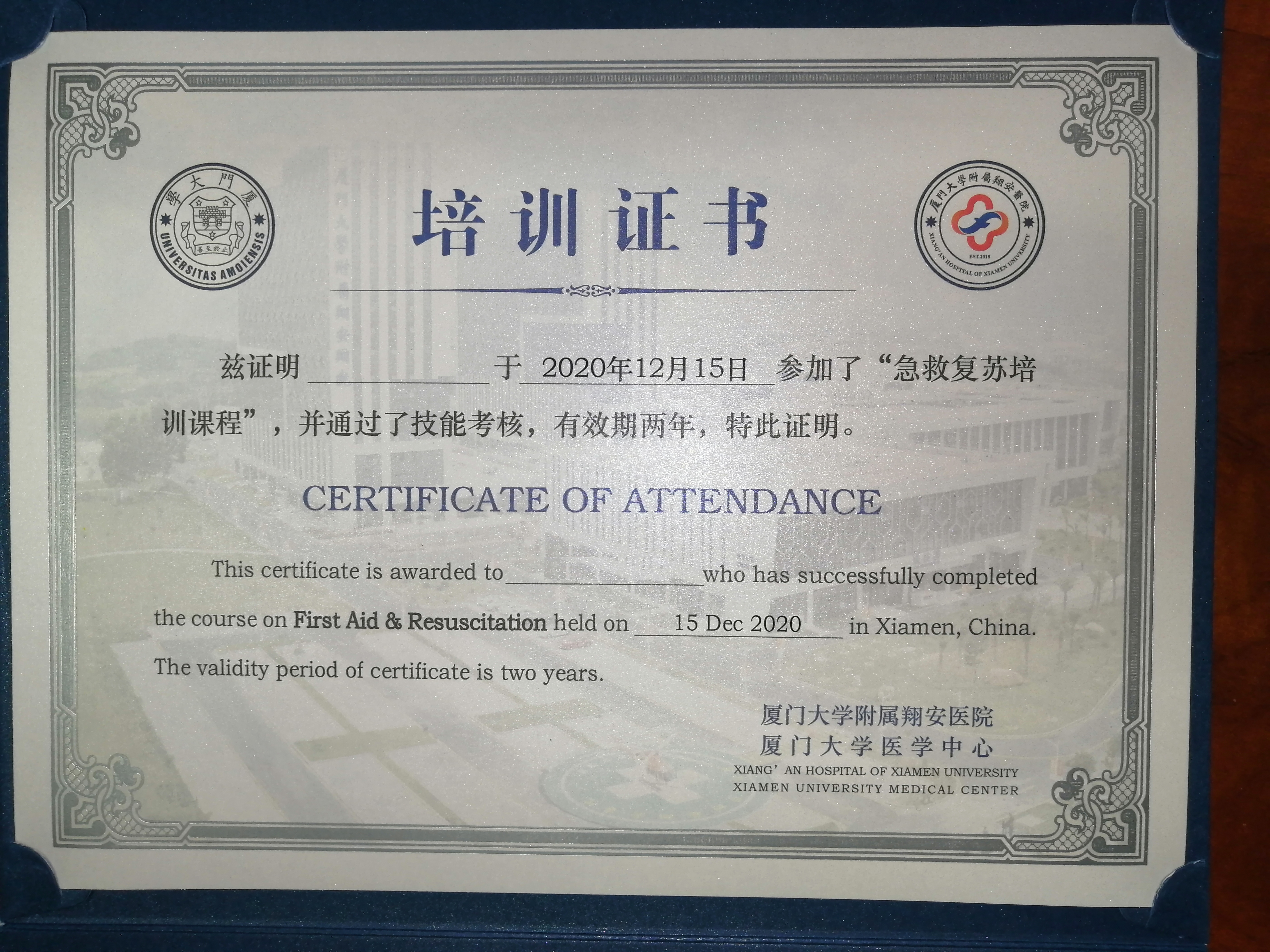 通过本次培训,报名参加的17名实验室管理人员均顺利通过现场模拟急救考核,并荣获培训合格证书。大家对心肺复苏技术和AED使用都有了更深的认识,不仅丰富了急救知识,更传承了“救人救己,服务他人,奉献社会”的急救理念,为加强突发公共事件应急管理、提升突发公共卫生事件应急处置能力提供准备,为建设健康中国、建设平安校园贡献力量。
