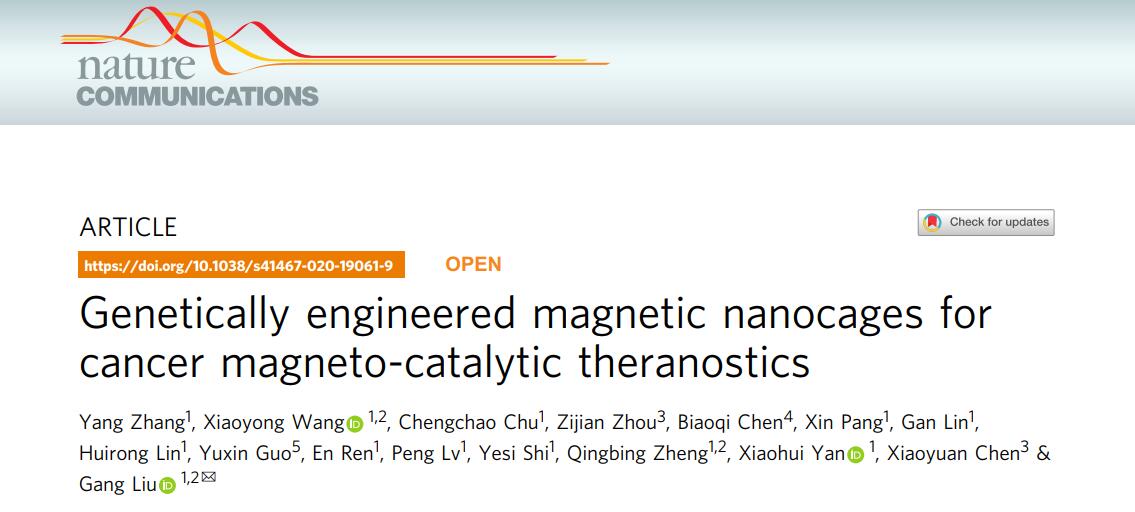 2020年10月27日,国际知名期刊Nature Communications(IF 12.121,JCR1区)在线发表了我院2017级博士生张阳为第一作者的研究论文《Genetically engineered magnetic nanocages for cancer magneto-catalytic theranostics》。该研究利用基因工程和仿生矿化技术制备出具有优异磁-热转化能力及纳米酶催化性能的磁性蛋白纳米笼(eMIONs),成功克服了临床磁热疗法中磁热敏剂低效的瓶颈,为新一代磁热敏剂的研发提供新的思路。