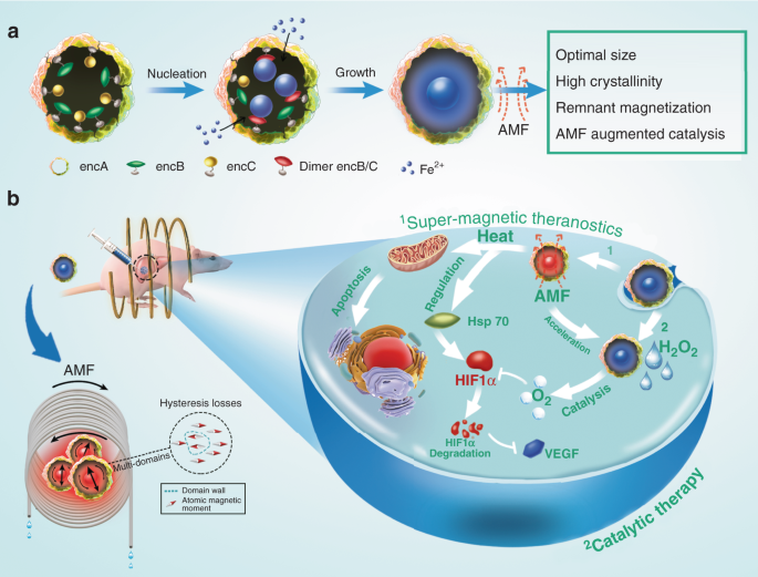 本研究中,通过重组了黄色粘球菌中的储铁蛋白,并利用绿色简单快速的仿生矿化技术制备出磁场特定吸收速率(SAR)高达2390 W/g的磁性蛋白纳米笼(eMIONs),比临床用的菲立磁(Feridex,115 W/g)提高了20倍。因此,eMIONs的磁-热转化效率极高,5分钟内即可达到有效热疗温度(15kA/m,300kHz)。经探究发现,其具有优异磁响应性能的机理是eMIONs拥有适宜的粒径尺寸,结晶度几乎达到100%,而且在磁场中具有剩磁效应。更有趣的是,研究发现eMIONs还是一种高效的类过氧化氢酶,并且在磁场作用下,其催化效率大幅提升,从而有效的改善肿瘤微环境,实现磁热与催化作用的协同治疗。实验结果显示,eMIONs不仅能有效抑制小鼠皮下瘤模型的生长,还能将小鼠原位肝癌模型的生存时间延长一倍。因此,这种简单的仿生治疗策略成功克服了磁热疗法的瓶颈,也为生物纳米医疗开辟了的新方向。