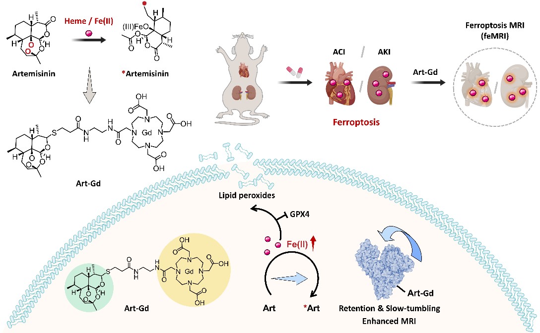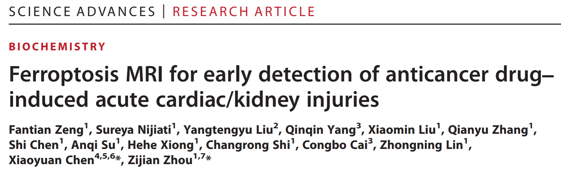 近日,我院分子影像中心周子健团队联合新加坡国立大学陈小元教授在Science Advances在线发表了题为“Ferroptosis MRI for early detection of anticancer drug-induced acute cardiac/kidney injuries”的研究成果。该研究利用青蒿素与活性铁(Fe2+)离子特异性反应后的大分子效应和滞留效应,设计并构建了自增强型活性铁池靶向MRI探针Art-Gd,实现了化疗药物导致的急性心肌/肾损伤的早期诊断和铁死亡抑制剂治疗的疗效监测。