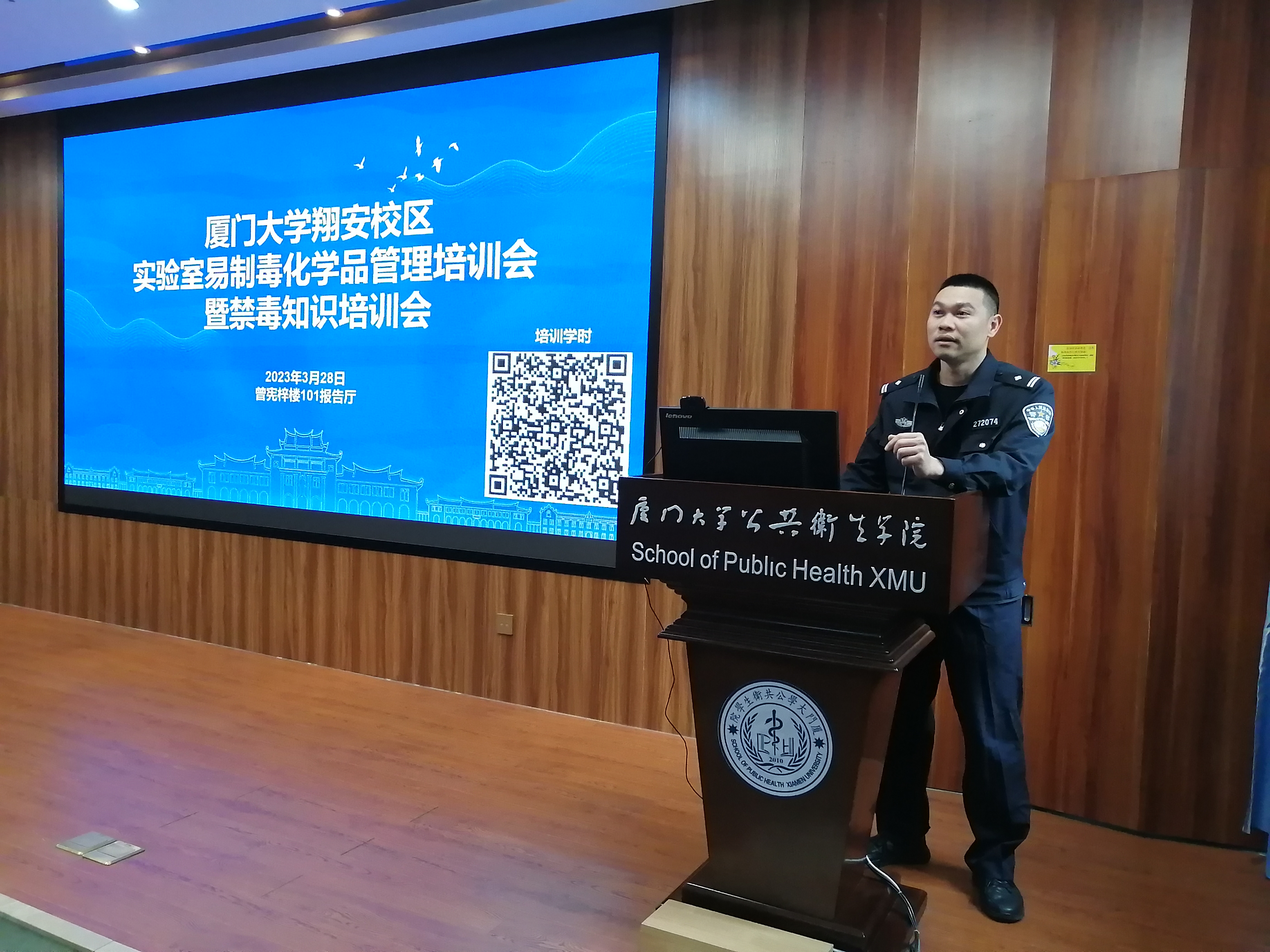 3月28日下午,学院配合翔安校区实验办组织召开翔安校区实验室易制毒化学品管理培训会暨禁毒知识培训会,邀请厦门市公安局翔安分局禁毒大队陈腾彬警官作易制毒化学品管理和禁毒知识培训,学院各实验室易制毒化学品管理员、易制毒化学品实验相关师生约180余人参加。通过培训,大家对实验室易制毒化学品要管哪些、怎么管、谁来管有了更深刻的认识。