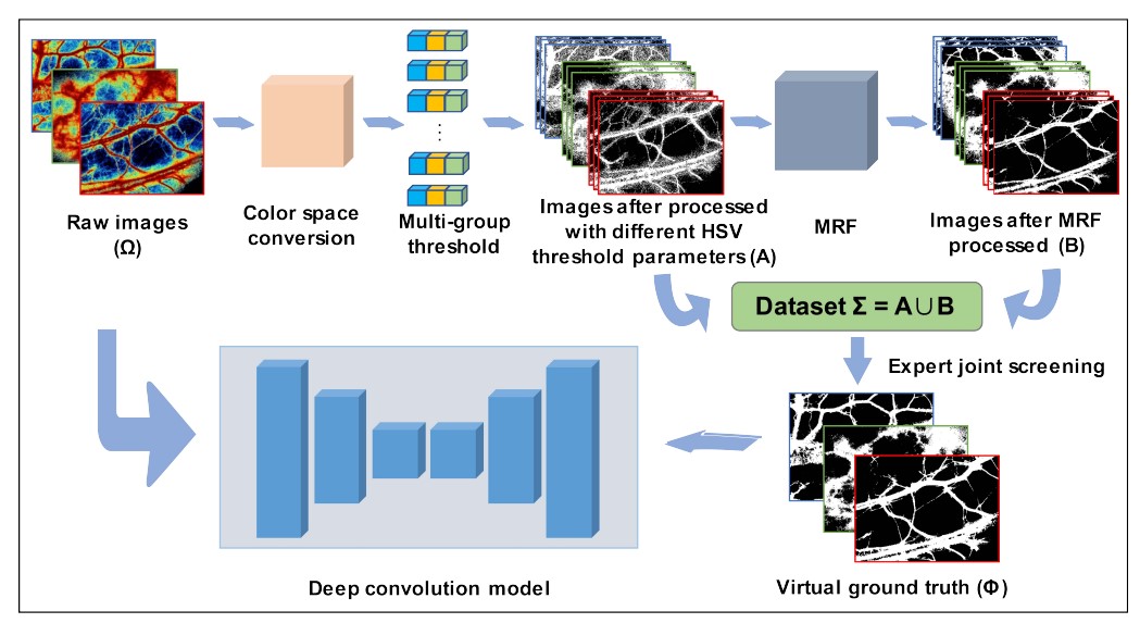 该工作中,研究者针对复杂微循环血管区域的LSCI图像,提出一种鲁棒的弱监督学习方法。该框架有效实现了疾病不同阶段组织区域的血管分割,有助于介入栓塞治疗。此外,采用多组阈值组合对不同阶段不同风格的图像进行处理,并对这些图像进行马尔可夫随机场(MRF)收敛。将两部分图像混合后,对分割结果进行联合筛选。为了构建具有弱监督信息的LSCI血管分割数据集,在处理流程中采用阈值组合选择方法,取代了人工标注的繁琐工作。该方法无需对LSCI图像数据集进行像素级标注,实现了对体表图像的有效血管分割,为LSCI在体内的应用提供了一种高效的方法,其泛化能力也在多个数据集上得到验证。