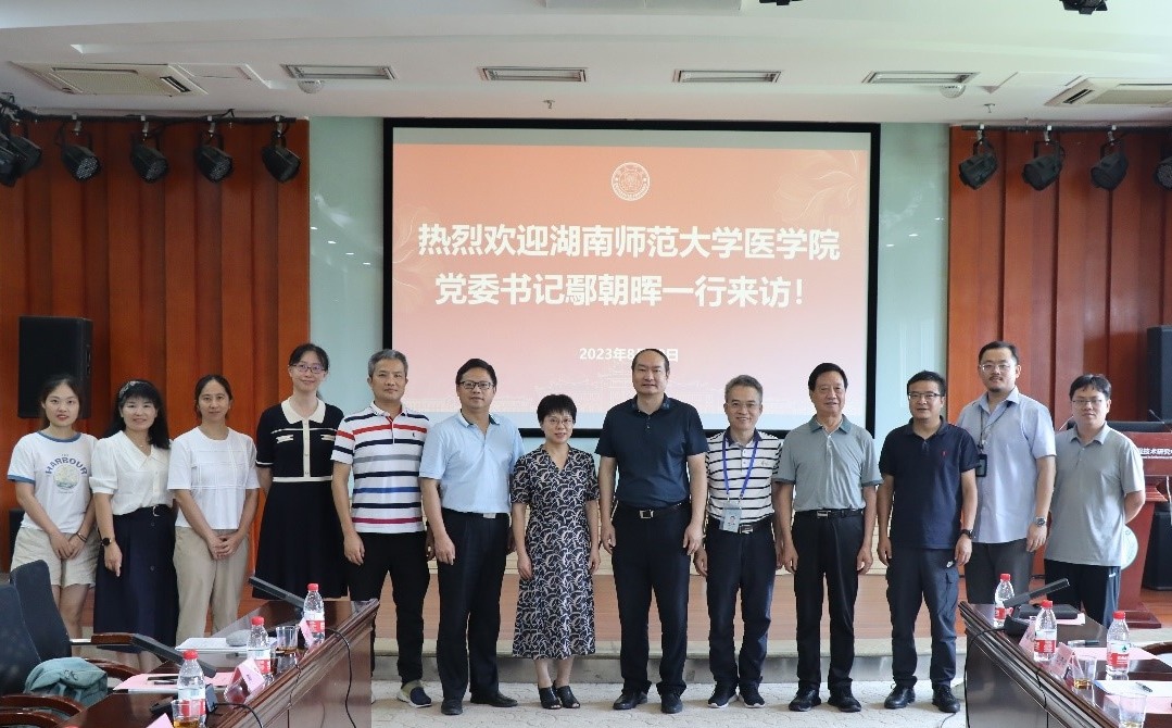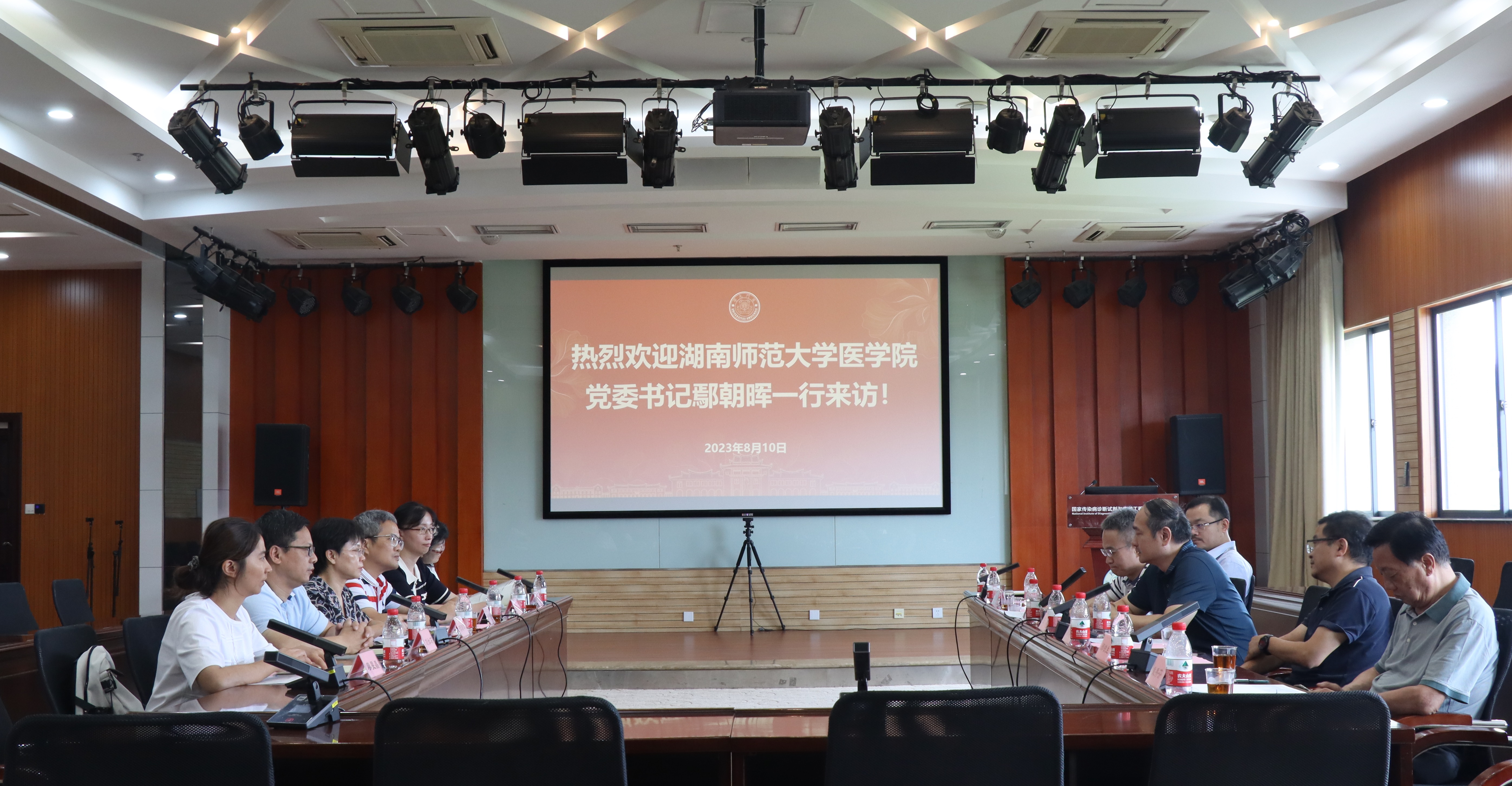 8月10日,湖南师范大学医学院党委书记鄢朝晖等一行到访我院调研并进行座谈交流。我院党委书记张琥、副院长林忠宁、实验医学系副主任(主持工作)郑子峥等共同参会。会议由学院副院长葛胜祥主持。