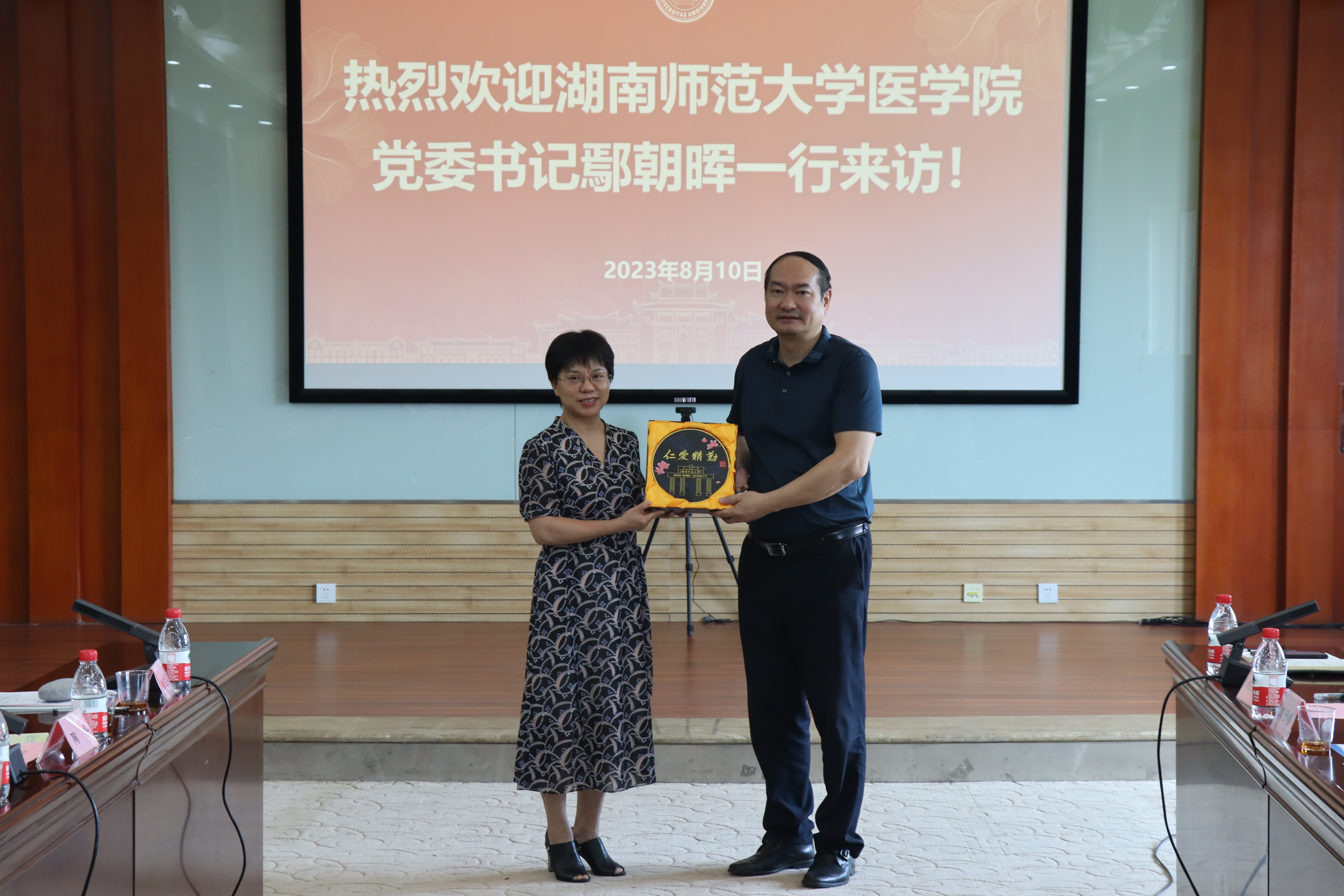 双方聚焦学院高质量发展建设进行了深入交流,均表示希望以本次交流为起点,依托各自优势,加强沟通、紧密合作,更好地推动学院建设和发展。现场讨论气氛友好热烈。随后,鄢朝晖代表湖南师范大学医学院向我院赠送纪念品。