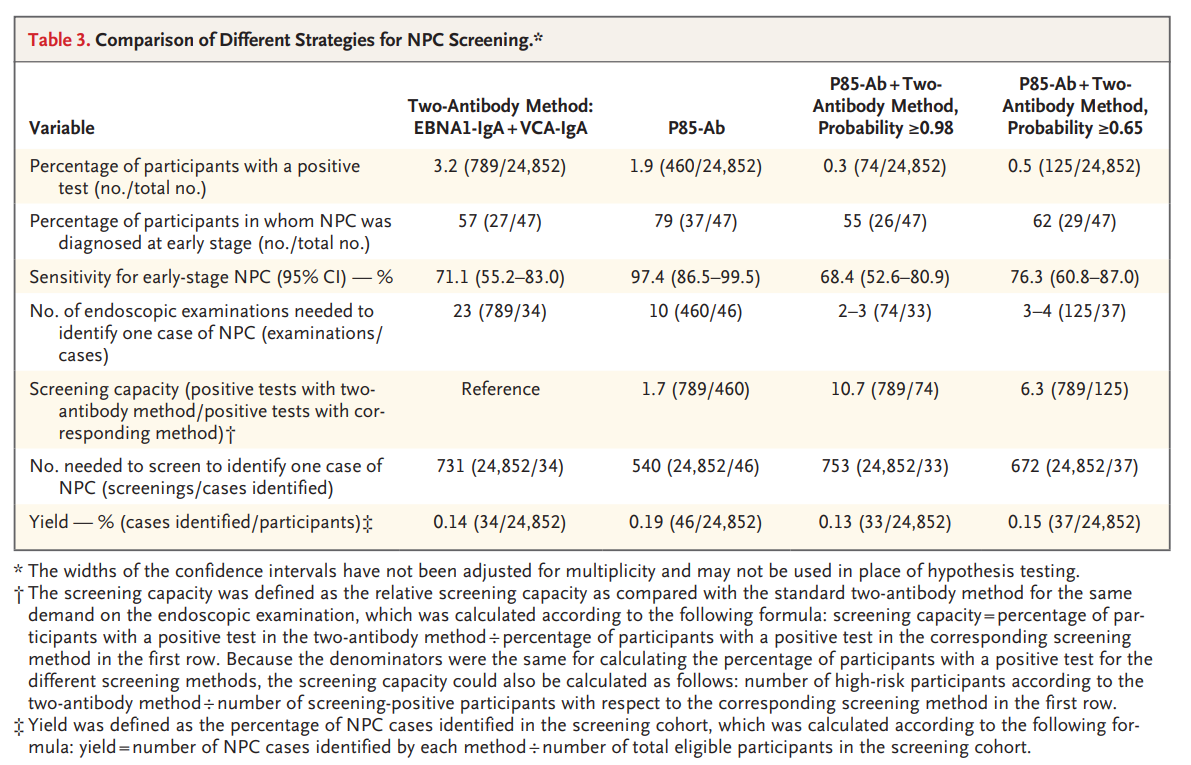 我院夏宁邵教授团队对鼻咽癌和健康对照者血清中抗EB病毒抗体谱进行系统研究,发现了一个全新的鼻咽癌血清学标志物:识别BNLF2b基因编码多肽的总抗体(简称“P85-Ab”),并与万泰生物联合研制出高通量自动化检测试剂盒。2020~2021年,我院夏宁邵教授团队和中山市人民医院季明芳教授团队合作在中山市开展了约2.5万人的前瞻性队列研究,头对头比较了P85-Ab检测与传统双抗体方案在鼻咽癌筛查中的效能。本研究共确诊47例鼻咽癌,38例为I/II期病例。相比于双抗体方案,P85-Ab体现出了两大突出优势: