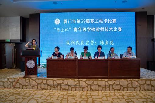 福建省立医院检验科副主任陈金花作为裁判代表宣誓,将严格比赛规则和裁判纪律,尊重参赛选手,严肃认真,文明裁判,决不徇私舞弊,做到公平、公正、公开,圆满完成各项裁判工作。