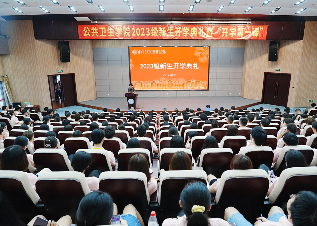 碧水清溪映长空,清秋玉露又金风。9月5日下午,公共卫生学院2023级新生开学典礼暨“开学第一课”在翔安校区德旺图书馆二号报告厅隆重举行。学院党政领导、教师代表、新生班主任和辅导员等,以及2023级306名新生参加本次典礼。典礼由学院党委副书记庄曦主持。