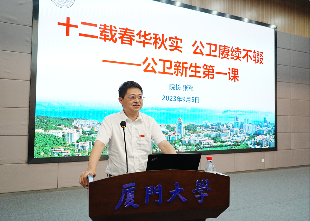 开学典礼结束后,院长张军教授以“十二载春华秋实,公卫赓续不辍”为主题为新生们上了精彩的“开学第一课”。他结合新时代公共卫生的新任务、新方针、新定位,和新冠疫情、核污染水排放等具体实例,向新生们阐述了公共卫生的广泛性与重要性。随后,他从学院的发展过程、办学硬件条件、组织架构、专业/学科设置、人才培养、师资队伍、科学研究、社会服务、文化传承等方面作了详细介绍,并着重强调了学院师生服务国家重大战略与需求的家国情怀与社会使命,帮助新生们更好地了解学院的发展概况和目标前景。最后,张军以“学无止境,脚踏实地,珍惜青春”寄语在场新生,希望大家能够度过充实且有意义的大学生活。