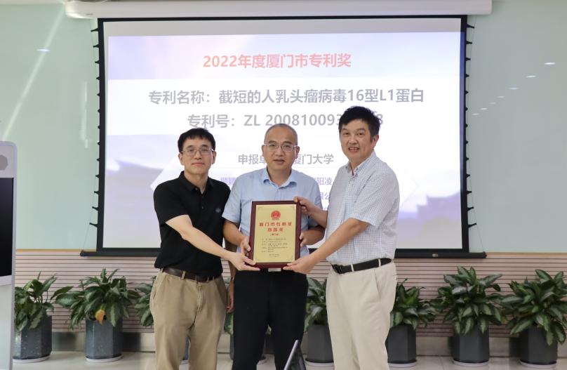 最后,吴煌开处长代表市局向获奖团队代表夏宁邵教授、李少伟教授授予厦门市专利奖特等奖奖牌。今年6月,第九届厦门市专利奖获奖名单出炉,42项专利榜上有名。其中,厦门大学与厦门万泰沧海生物技术有限公司联合申报的“截短的人乳头瘤病毒16型L1蛋白”专利获得本届专利奖唯一的特等奖。该专利完成转化,打破了国际疫苗巨头的HPV疫苗垄断,而应用该专利技术生产的首个国产HPV疫苗的成功上市,则使我国成为全球第三个实现HPV疫苗自主供应的国家。目前,该疫苗已获得WHO PQ认证,并在摩洛哥、泰国等海外七国上市,纳入我国5省(直辖市)及15市(自治州)政府实施的免费HPV疫苗接种项目,取得了显著的经济效益和社会效益。