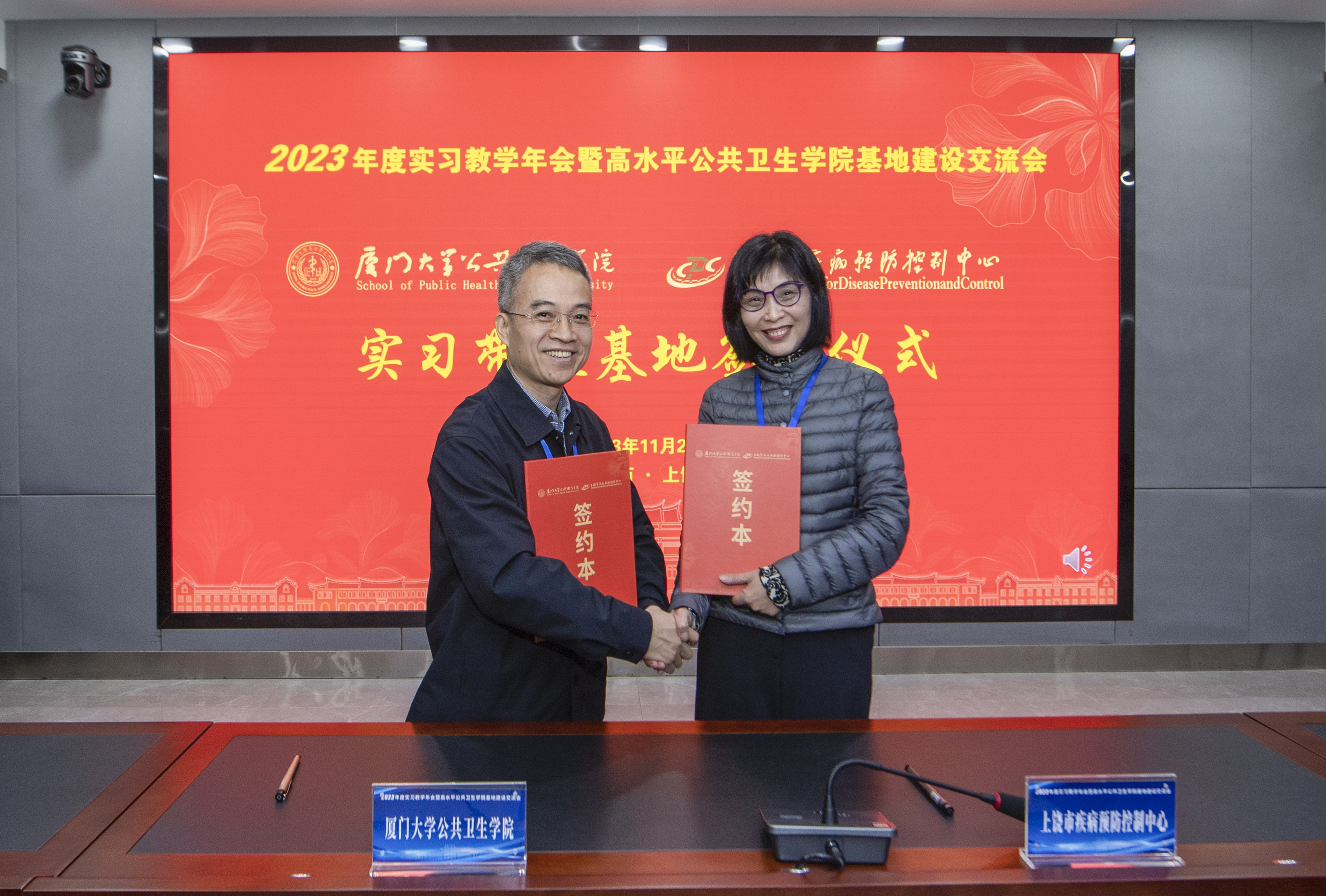 签约仪式上,林忠宁与王晓岚在参会人员的共同见证下,代表双方签订《厦门大学公共卫生学院与上饶市疾病预防控制中心实习带教协议书》。
