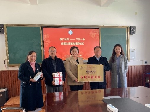 12月29日,招生宣传组一行代表厦门大学为下关一中授予“厦门大学优质生源基地”牌匾并赠送厦大百年校庆系列出版物。下关一中校长刘式良、副校长杨凤丽、纪委书记杨志康、教务科科长赵寅辉等参加座谈。