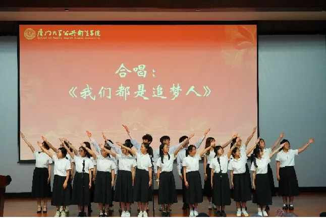 表彰大会还准备了两场表演节目,其中2023级本科生合唱队带来了激情昂扬的合唱节目《我们都是追梦人》,学院年度十佳优秀学生带来了一段悠扬深情又令人激情澎湃的诗朗诵《多彩厦大,绚丽公卫》。