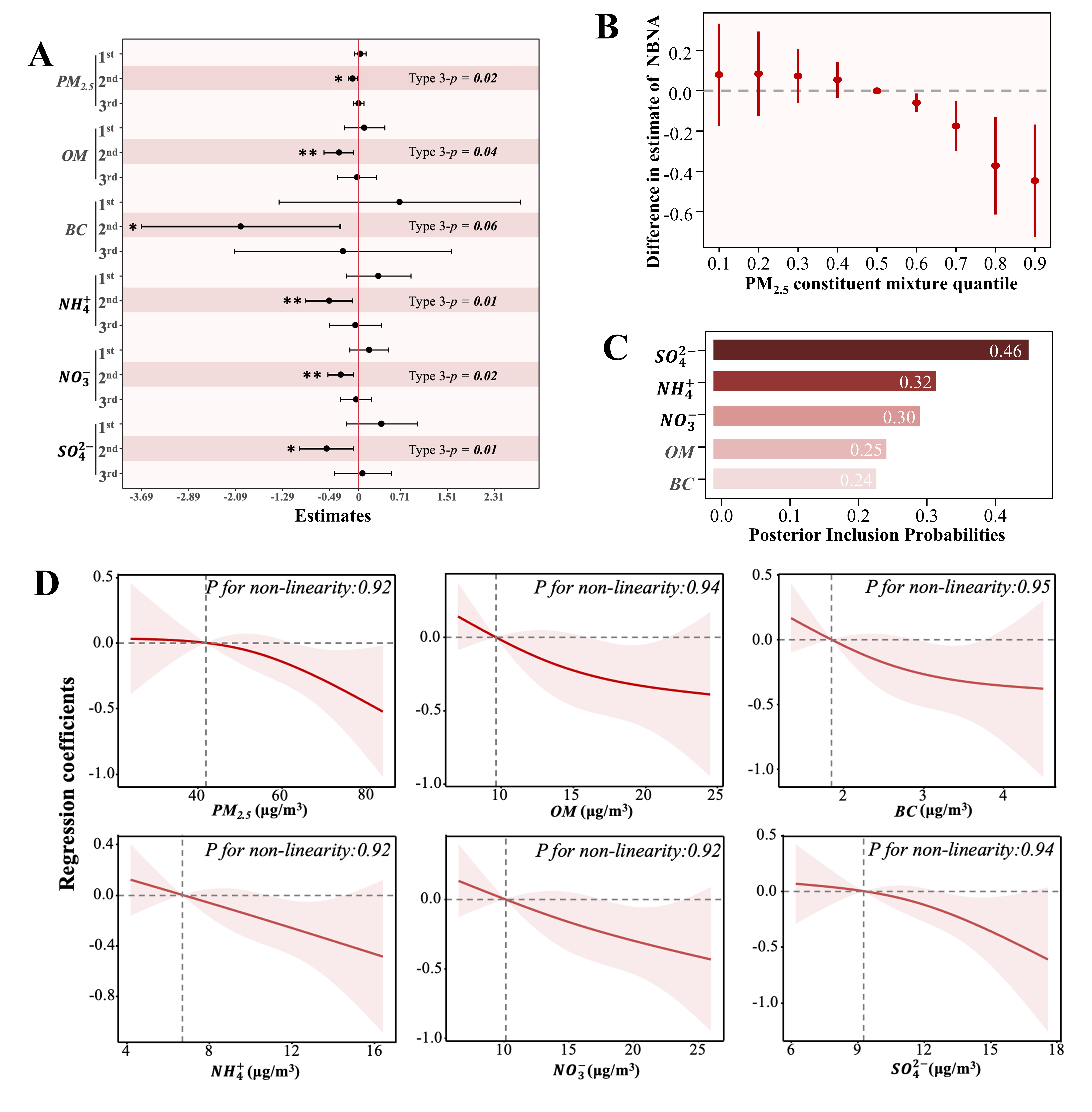 研究结果显示,孕中期PM2.5及其组分暴露与NBNA评分下降之间存在线性剂量反应关系。利用贝叶斯核函数回归(BKMR)模型进一步探索多组分混合暴露的健康效应,发现孕中期PM2.5组分混合物与NBNA评分呈负相关,硫酸盐的神经毒性作用最强。