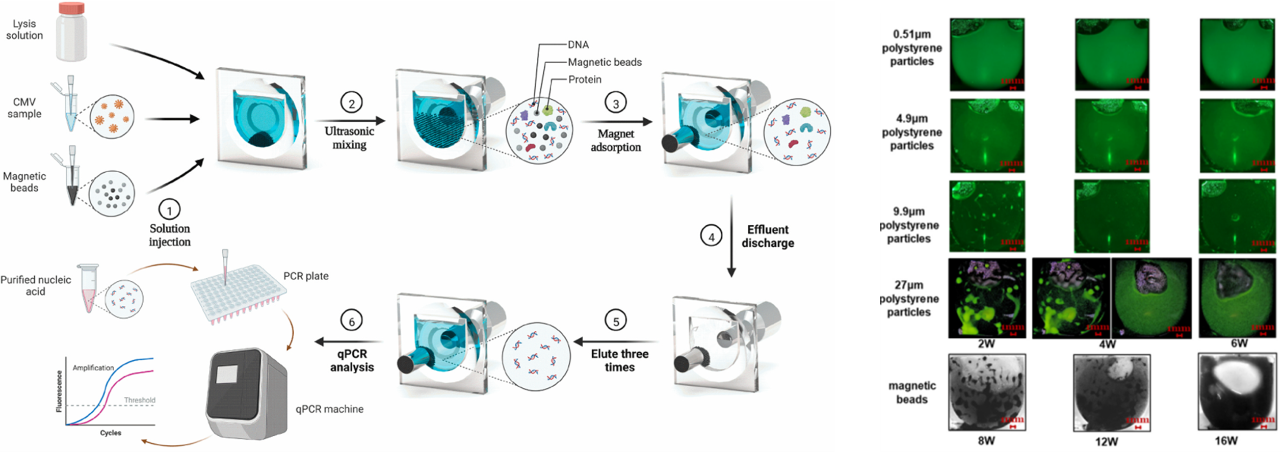 核酸提取是核酸检测的重要上游步骤。为了实现核酸提取快速、高效和自动化,研究人员建立了一种基于磁珠法的超声辅助核酸提取系统。该系统通过对磁珠和试剂混合的复杂多物理场过程进行耦合建模,结合声学知识和机器学习的非接触式流动模式测量方法对磁珠及流体运动进行量化表征,指导微流控芯片反应腔结构设计与超声波激励策略的改进,显著提升了提取性能。实验表明,基于声流体动力学模型进行超声参数和结构的优化,可以有效增强声流效应,从而促进试剂与磁珠的混合性能。例如当超声入射角为10°时,混合指数可提高84%;增加的锥形和薄片微结构可分别使局部混合指数达到83.6%和92.5%;在单步混合过程中,仅需15秒的超声连续激励就能达到与手工混合10分钟相当的提取性能。此外,使用流场模式测量方法对1946幅流场图像进行标注,平均识别精度可达到96.4%。通过该方法对实际流场的测量和分析,进一步优化超声波激励策略,使得系统的性能与“金标准”人工核酸提取方法相当,对于弱阳性样本的检出率达到100%,而完成完整提取的耗时仅为人工提取的40%。