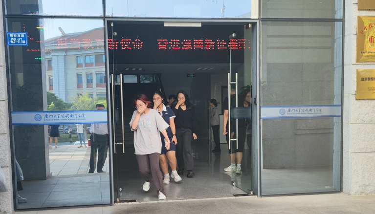 首先进行的是消防疏散演练。演练模拟曾宪梓楼某实验室发生火灾,现场火势猛烈,浓烟较大且迅速向周围蔓延。值班人员发现险情后,立即启动应急预案,拉响警报并组织楼内人员疏散,同时启动学院火灾应急处置上报程序。楼内师生接到警报后,沉着冷静、有序撤离。