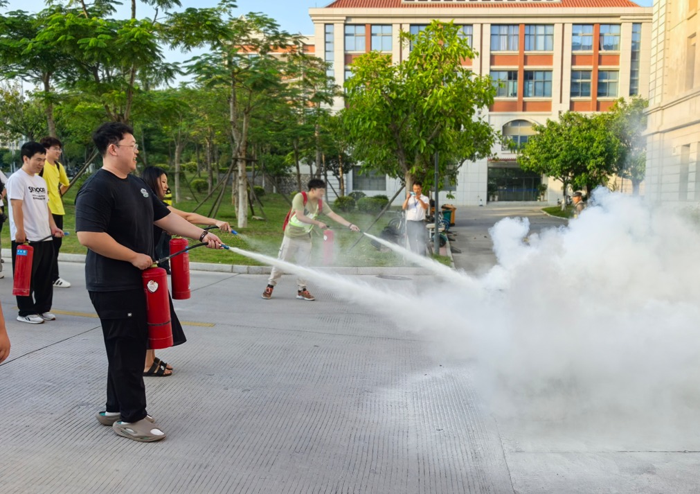 在消防知识培训及灭火演练中,学校保卫办、南强物业公司指导老师详细介绍了初起火情的扑救方法及灭火时的注意事项,并分别演示了灭火器、灭火毯、过滤式消防自救呼吸器及消防水带的规范操作流程,现场师生分组并开展灭火实操演练。