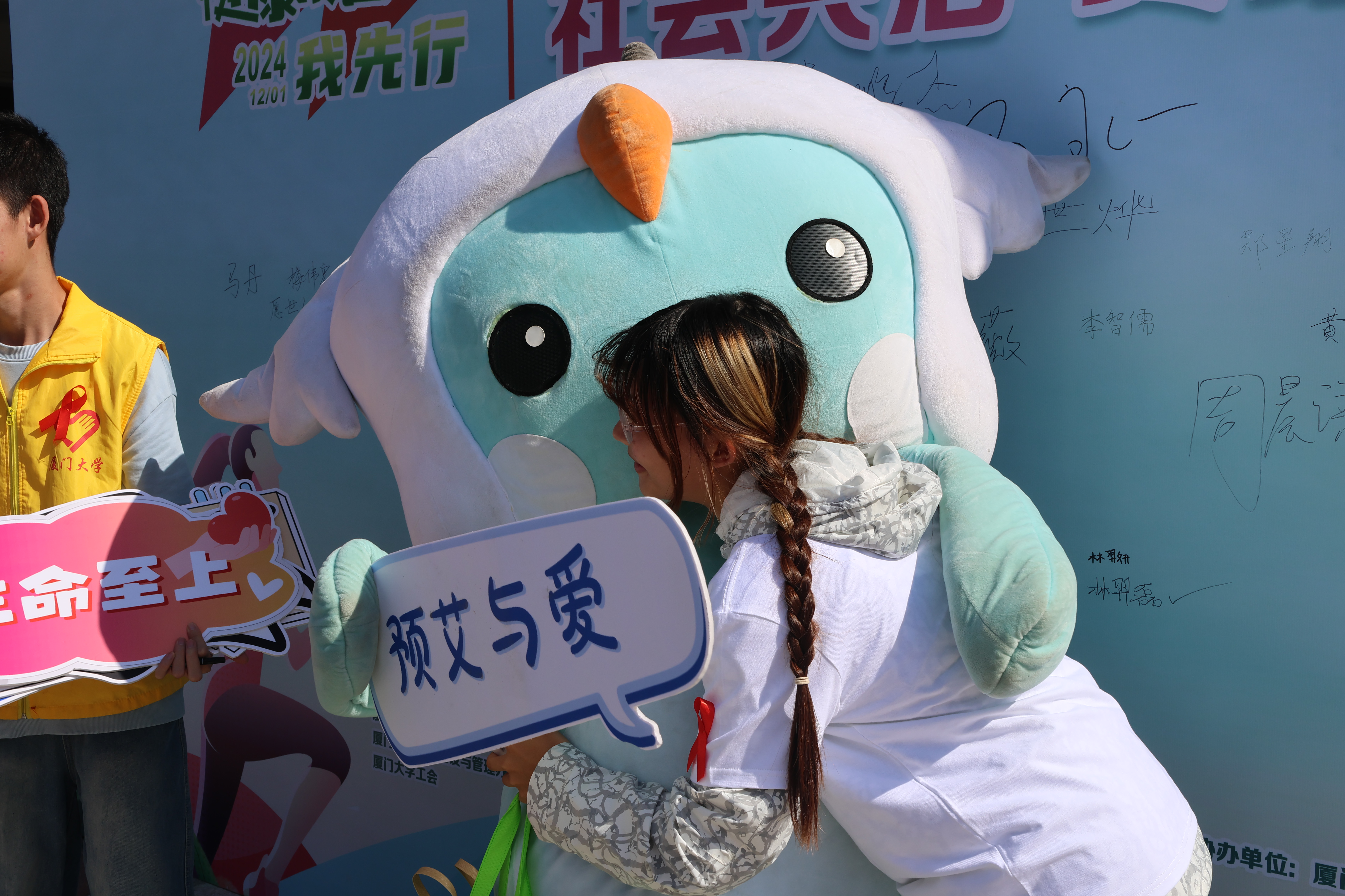 在思明校区三家村广场和翔安校区竞丰餐厅前广场同步进行的还有现场科普宣传。活动以展示防艾主题海报和开展知识竞答游戏的形式,普及艾滋病相关知识,呼吁大家自觉做好防范工作,提高防艾意识。学院志愿者、青春健康先锋党支部成员积极为路过的师生佩戴红丝带,传递欢乐与温暖。现场还安排了“社会共治,终结艾滋,共享健康”主题祝愿签名、“温暖抱抱”拥抱艾滋病人和禁毒科普宣传等一系列相关活动,帮助大家消除艾滋偏见,传递爱与关怀。