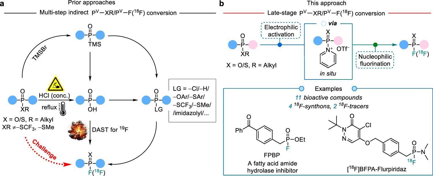 团队通过三氟甲磺酸酐(Tf2O)和吡啶(Py)的逐步亲电活化策略,将膦酸烷基酯转化为高电亲性的PV物种,随后与F⁻发生亲核取代反应形成PV−F化合物。该方法展现出对膦酸烷基酯底物的高选择性和广泛的底物适用范围,极大提高了脂肪酸酰胺水解酶抑制剂(FPBP)的合成效率和安全性。在放射性氟化中成功合成了多种18F示踪剂,显著优化了如[18F]BFPA-Flurpiridaz等具有临床潜力的PET示踪剂的制备路线。这一策略有望用于其他基于P═O骨架的化合物的合成设计中,增强药物亲和力并改善药代动力学特性。