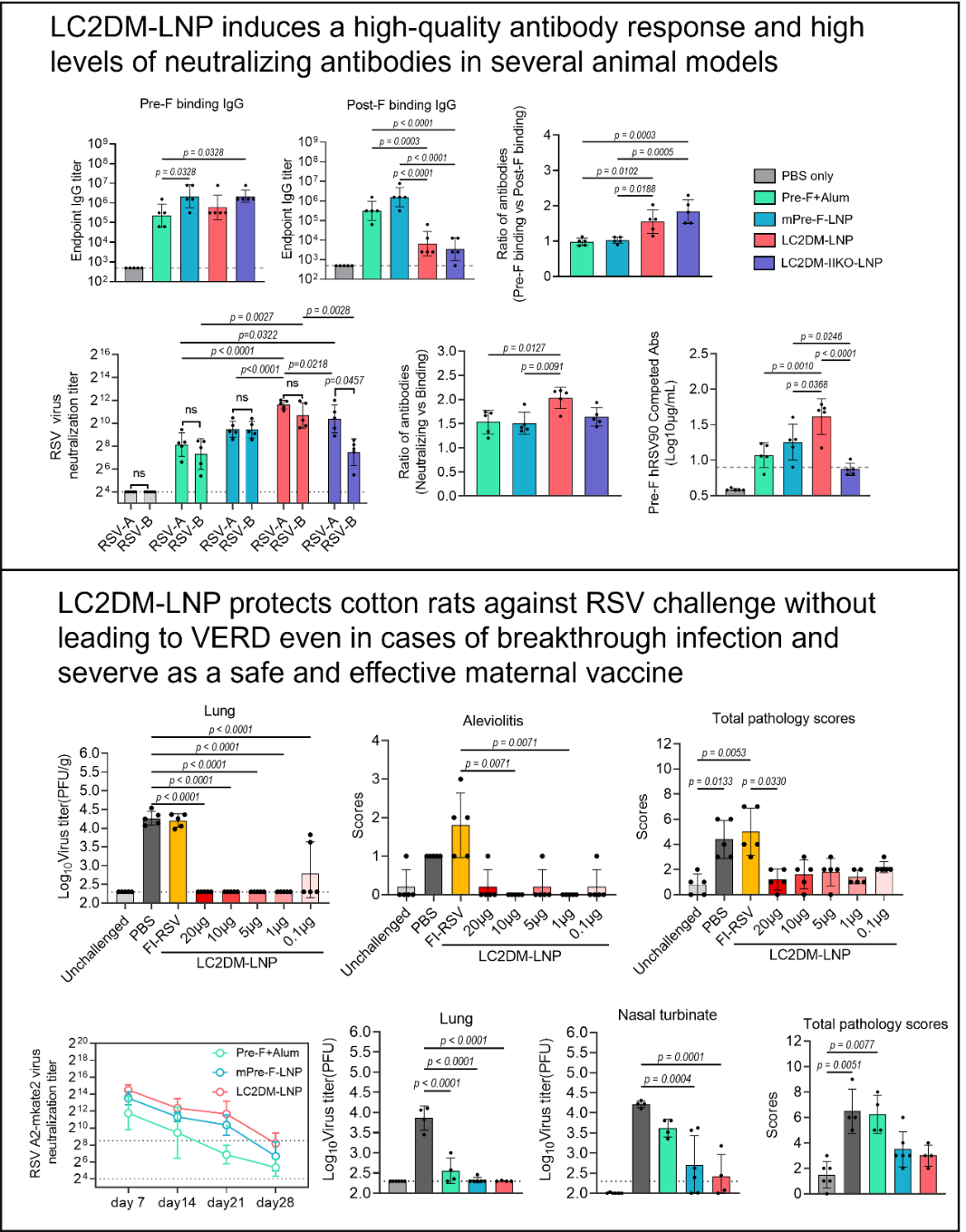 研究团队采用脂质纳米颗粒(LNP)递送LC2DM分子的mRNA,并在小鼠和棉鼠模型中进行了系统评估。结果表明,LC2DM-LNP疫苗能诱导更高效的中和抗体反应,且相比于传统pre-F疫苗,其中和抗体与结合抗体的比值更高,显示出更优异的抗体质量。此外,该疫苗在高龄小鼠模型中同样表现出强效的免疫应答,提示其在老年人群中的应用潜力。VERD是RSV疫苗开发过程中需要重点关注的安全性问题,特别是在婴幼儿人群中。研究团队在棉鼠模型中进一步评估了LC2DM-LNP的安全性和保护作用。结果显示,LC2DM-LNP不仅能有效预防RSV感染,并且受免疫动物在突破感染后未表现出加重的肺部炎症,未观察到VERD现象的发生。此外,LC2DM-LNP能诱导Th1偏向的T细胞应答,这一免疫特征有助于降低VERD的风险。考虑到婴幼儿是RSV感染的高危人群,研究团队还探索了LC2DM-LNP作为母体疫苗的可行性。在母体棉鼠免疫实验中,接受LC2DM-LNP免疫的母鼠能将高滴度的pre-F特异性抗体传递给幼鼠,并在出生后4周内维持较高的中和抗体水平。进一步的RSV攻毒实验显示,这些幼鼠在受到RSV感染后能有效抑制病毒复制,并避免严重肺炎的发生。