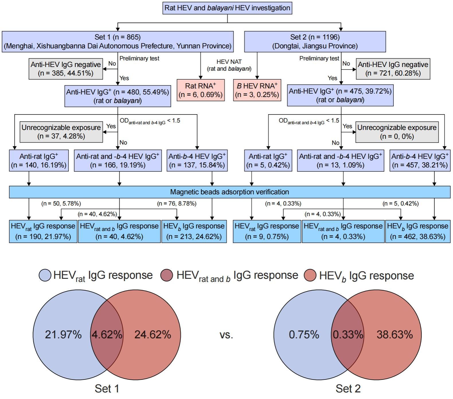 综上所述,该研究建立了能有效区分HEVrat与HEVb既往暴露的DARE方法,并通过我国有限地区的样本发现HEVrat的既往暴露风险可能远超此前认知,其人兽共患风险值得持续关注。同时,该研究结果也表明我国戊型肝炎负担仍以HEVb为主,HEVrat的整体致病风险仍需持续对其开展动态监测,以便及时主动应对潜在的突发公共卫生风险。