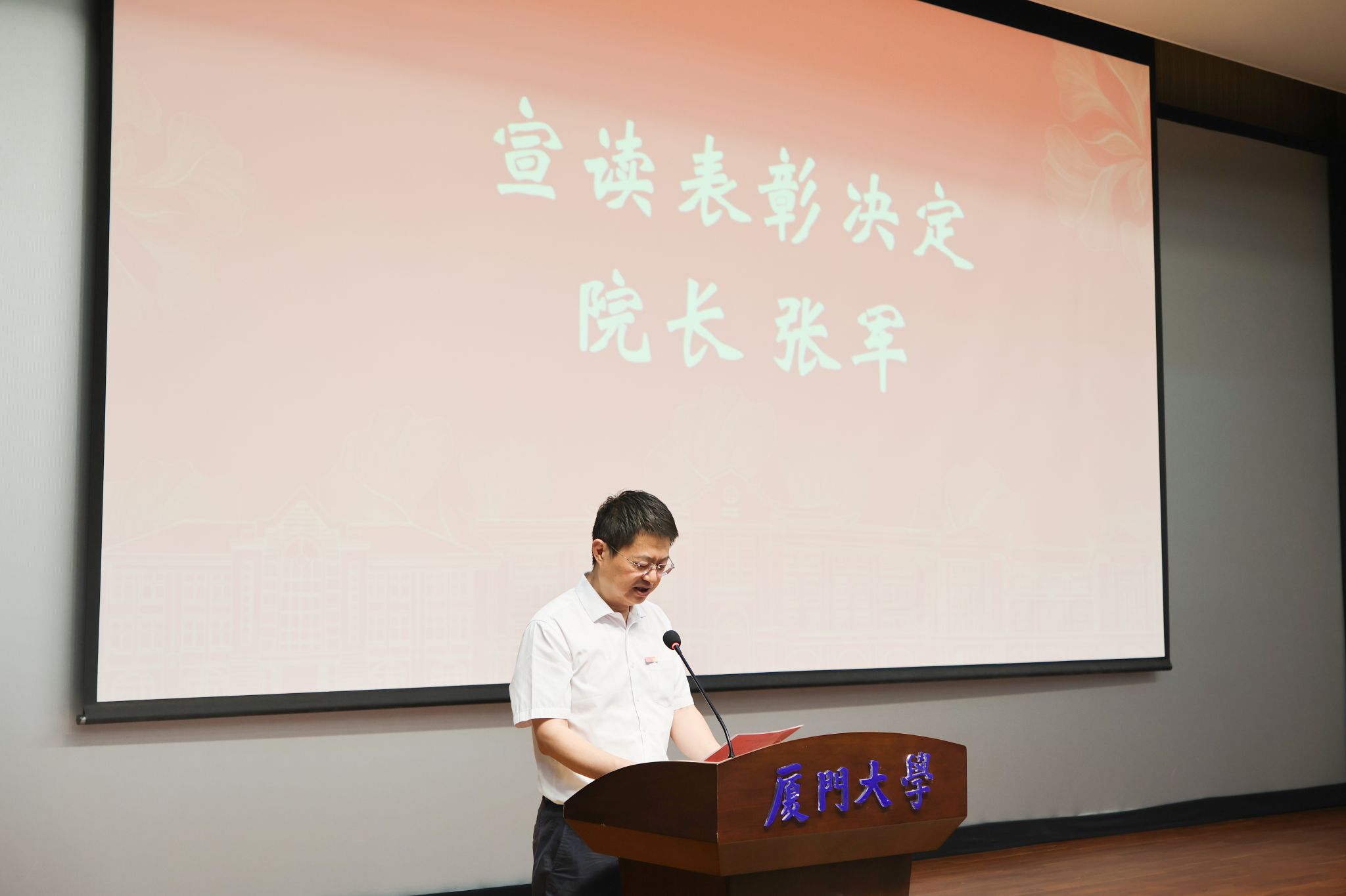张军宣读表彰决定,授予刘刚等82位老师和重组戊型肝炎疫苗长期有效性研究团队等12个集体学院奖教金;授予代奇轩等154名学生和“鹭疆先锋实践队”等16个集体学院奖学金。