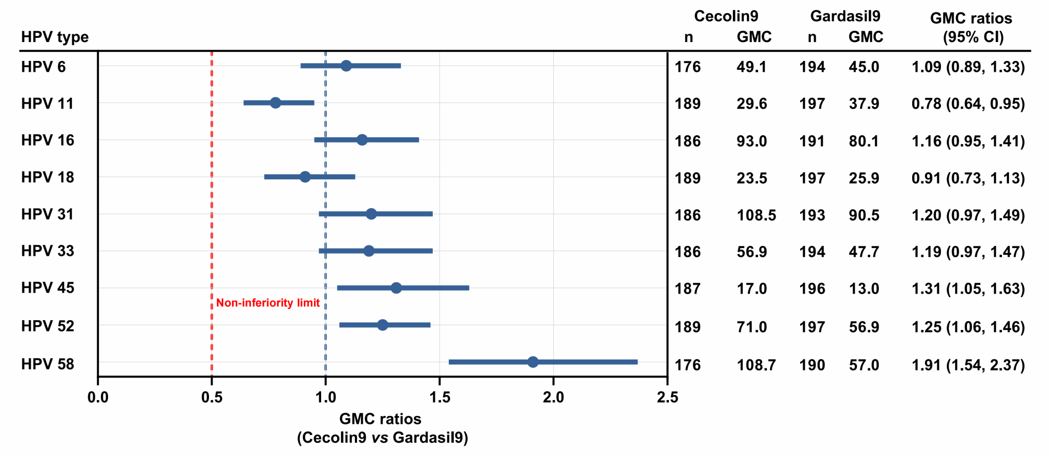 作为临床研发阶段的重要试验之一,我院研究团队于2021年开展的一项馨可宁®9与Gardasil®9的头对头研究直接比较二者的免疫应答效果。这项严格的随机对照试验证实,18~26岁中国女性全程接种后1个月(第7个月)时,馨可宁®9可诱导出非劣效于Gardasil®9的HPV型别特异性免疫应答,提示其可能具有与Gardasil®9相似的保护效力(Lancet Infect. Dis. 2023)。