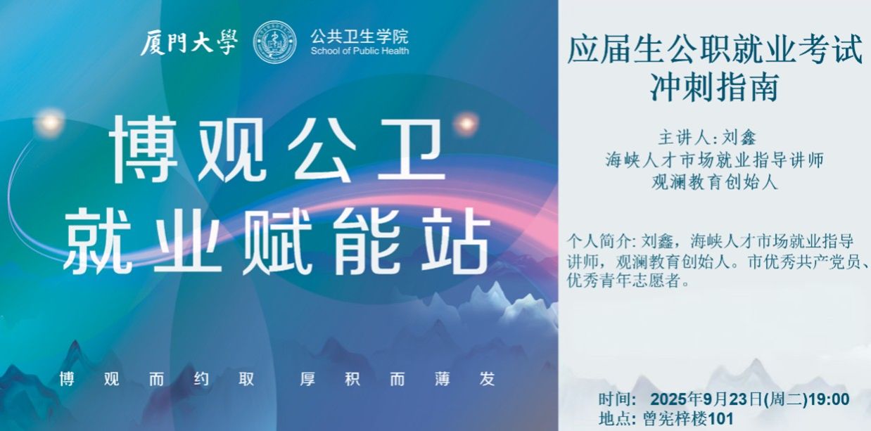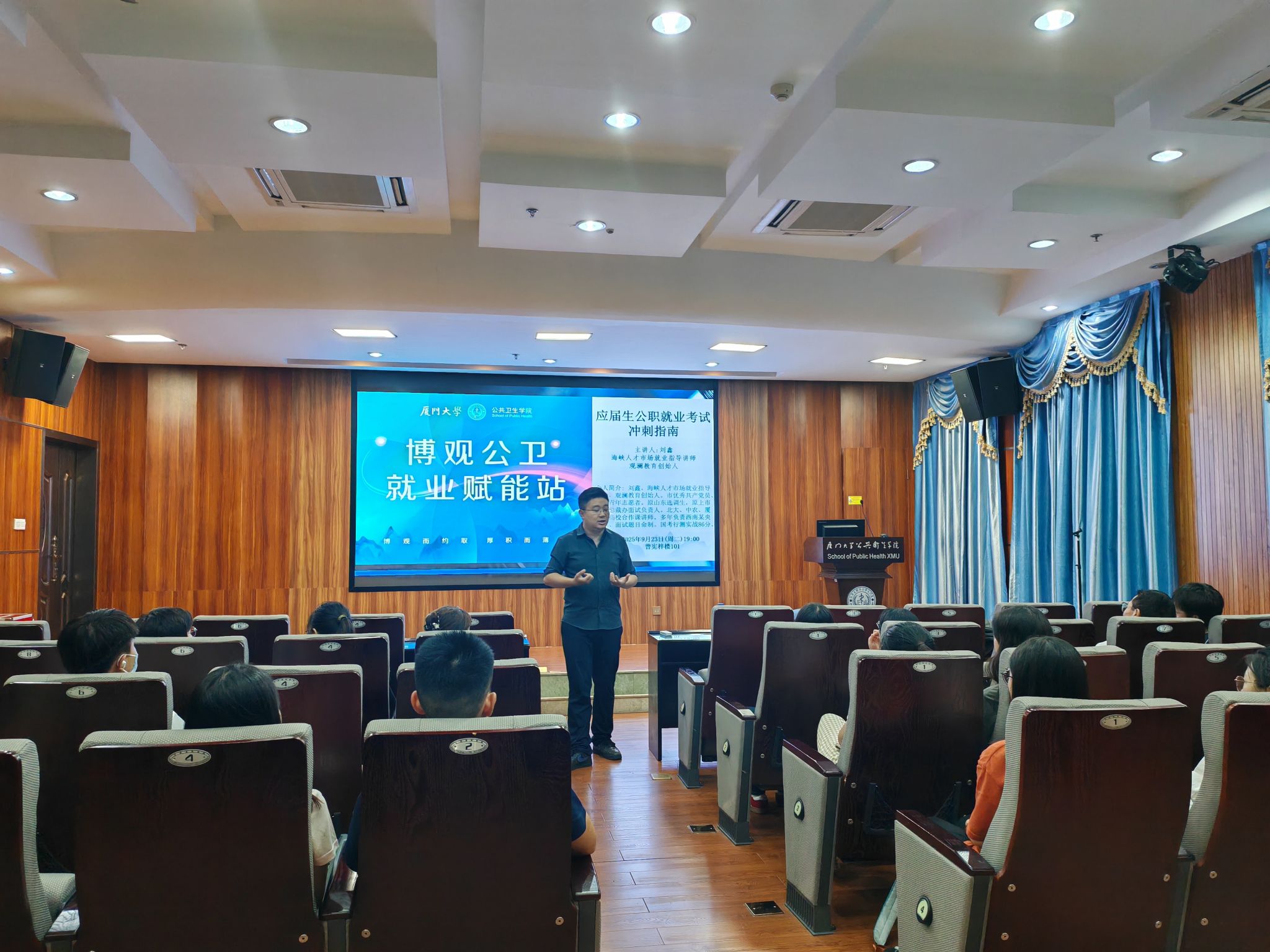 为提升2026届毕业生公职类考试备考能力,9月23日,我院在曾宪梓楼101会议室举办“博观公卫·就业赋能站”系列活动之“应届生公职就业考试冲刺指南”就业指导讲座。本次活动特邀海峡人才市场就业指导讲师、观澜教育创始人刘鑫担任主讲嘉宾。
