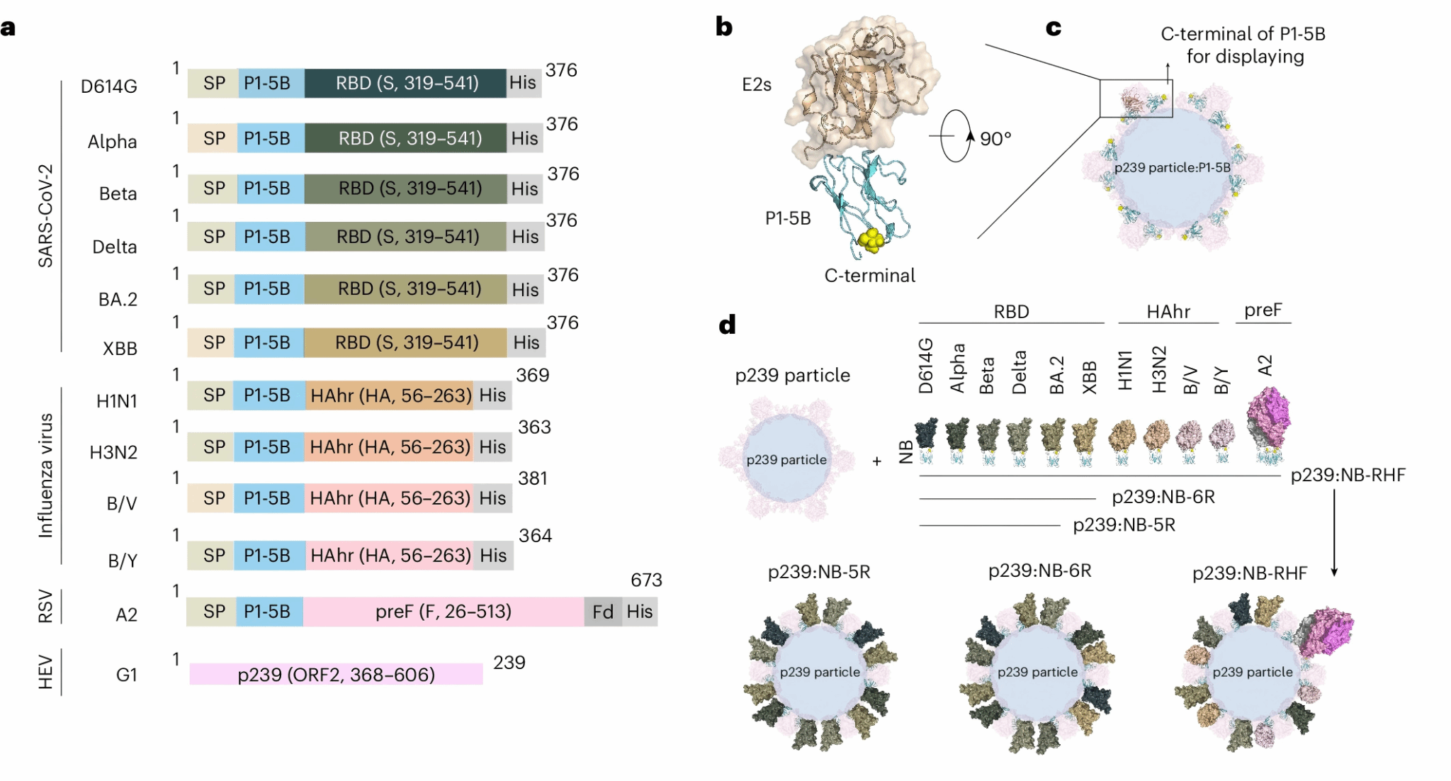 与现有的以铁蛋白、mi3等颗粒为底座,利用Spytag/Spycatcher接头的纳米颗粒展示系统不同,我院研究团队提出了一种基于已上市疫苗颗粒的联合疫苗模块化设计策略。该策略采用单一组分的纳米抗体作为接头(nanobody binder,NB),通过将来自不同病原体或型别的抗原与接头融合表达,能够使抗原同时直接且非共价地结合到已上市戊肝疫苗(益可宁®)中的p239颗粒抗原上,实现颗粒化,成为一种“即插即用”的快速转化和可定制的联合疫苗系统。首先,研究人员利用戊肝疫苗免疫羊驼,并通过噬菌体展示技术筛选出戊肝特异性纳米抗体P1-5B。纳米抗体-戊肝E2s蛋白复合物的共晶结构显示,P1-5B高亲和力结合于p239颗粒表面凹陷处,而其C末端朝向颗粒外部,为多抗原展示提供了可扩展“接口”。接下来,研究团队构建并测试了最多展示11种抗原的“四合一”联合疫苗—p239:NB-RHF(图),包括6种新冠病毒突变体抗原、4种流感病毒亚型抗原和1种呼吸道合胞病毒三聚体抗原。免疫学研究显示,在小鼠、仓鼠和非人灵长类动物中,p239颗粒展示的各种抗原相比单独抗原诱导的中和抗体滴度提高了1至3个数量级,是展示在铁蛋白颗粒上的抗原产生抗体滴度的10倍左右,并能交叉中和异型毒株,同时还保留p239自身的疫苗免疫原性。在四种病毒的动物模型实验中,联合疫苗展现了良好的安全性,并能有效保护仓鼠免受异源新冠病毒BA.5的致死性攻毒,保护小鼠免受H1、H3、B/V和B/Y四种异源流感病毒以及RSV病毒的致死性攻毒,保护食蟹猴免受两种型别戊肝病毒(1型和3型)的感染和致病。最后,研究团队对这一新型颗粒展示模式进行了免疫机制研究,发现p239颗粒展示可促进抗原呈递细胞如树突状细胞和巨噬细胞的抗原摄取,触发高效的生发中心反应,激活高水平的抗原特异性B细胞和记忆B细胞应答。研究还发现,即使在建立三针戊肝疫苗适应性免疫后继续接种该纳米颗粒联合疫苗,其效力不受戊肝载体预存免疫的影响。基于此,研究团队提出了“疫苗酶”概念,意为疫苗颗粒载体既是展示载体也是抗原本身,在抗原递送过程中并不会被消耗,从而实现了“抗原展示”与“原有免疫”的双重保留。