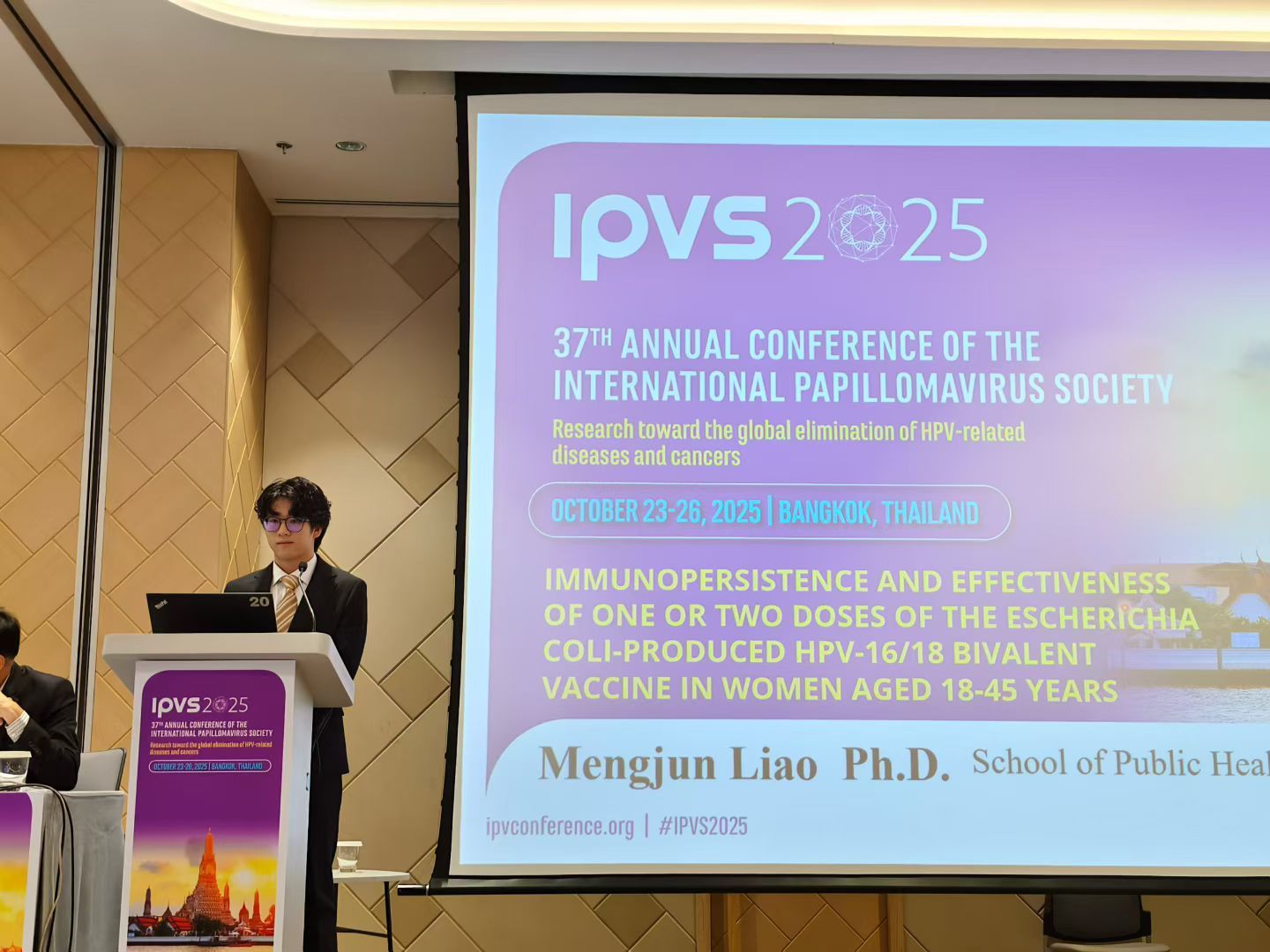 26日,博士研究生廖梦俊在分会场作题为“Immunopersistence and Effectiveness of One or Two Doses of The Escherichia coli-Produced HPV-16/18 Bivalent Vaccine in Women Aged 18-45 Years”的口头报告。研究表明,18-45岁女性接种一剂或两剂国产二价HPV疫苗具有良好的免疫持久性,能够提供至少5.5年的持续保护。在当前HPV疫苗接种覆盖率亟待提高的背景下,该研究为优化一剂或两剂国产二价HPV疫苗的接种策略提供了有力证据,具有重要的公共卫生应用价值。
