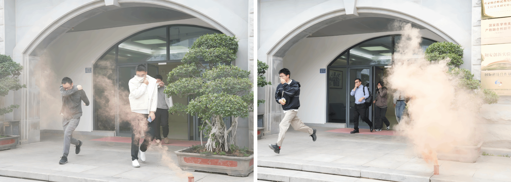 演练分为疏散逃生与技能实训两个环节。在疏散演练阶段,模拟了学院椭圆楼某实验室突发火情的场景。值班人员发现险情后,迅速启动应急预案,拉响警报并组织人员疏散。师生们反应迅速,沿疏散通道有序撤离至安全区域。