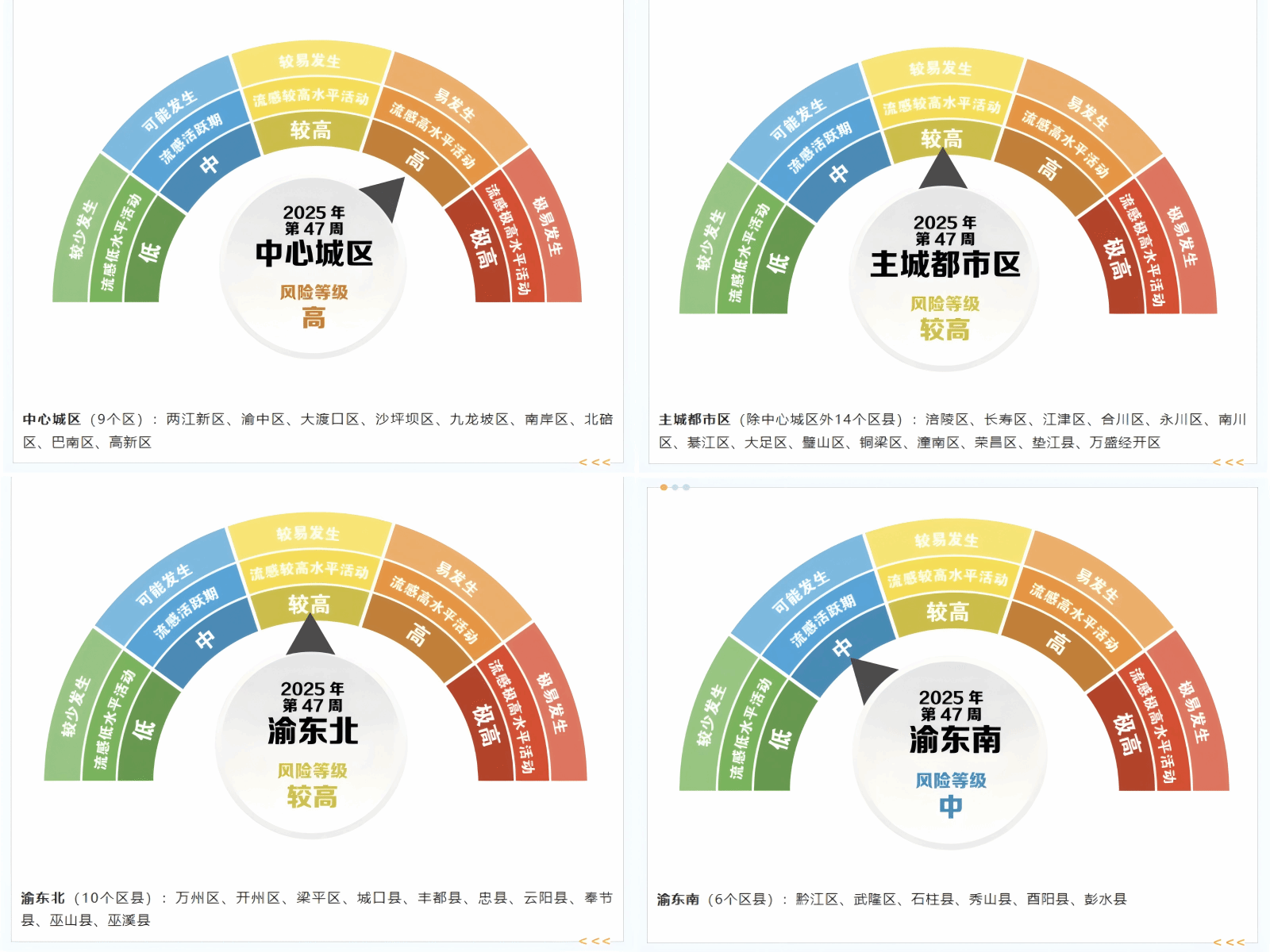 该系统创新性地集成了LSTM、GRU等多种深度学习模型,基于流感哨点监测的流行病学、病原学以及气象数据等多源异构数据进行了建模与预测,综合比较了单变量/多变量、多步/递归预测等多种建模策略效果,采用MEM法将重庆及不同区域的流感传播风险划分为低、中、较高、高、极高五个等级,通过多次交叉验证和专家论证优化模型性能,构建了一套稳定可靠的“多数据驱动、多模型并行、多等级预警”预测体系。