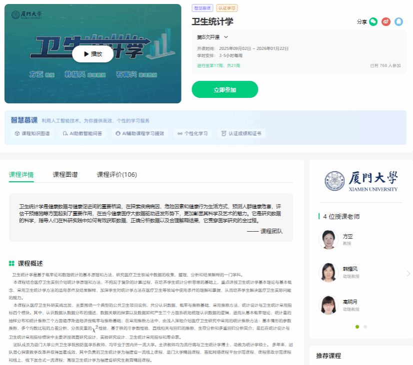 12月17日,教育部公示了关于第三批国家级一流本科课程认定的结果。我院预防医学系卫生统计与卫生管理课程组建设的《卫生统计学》成功入选教育部2025年度国家级一流本科课程。