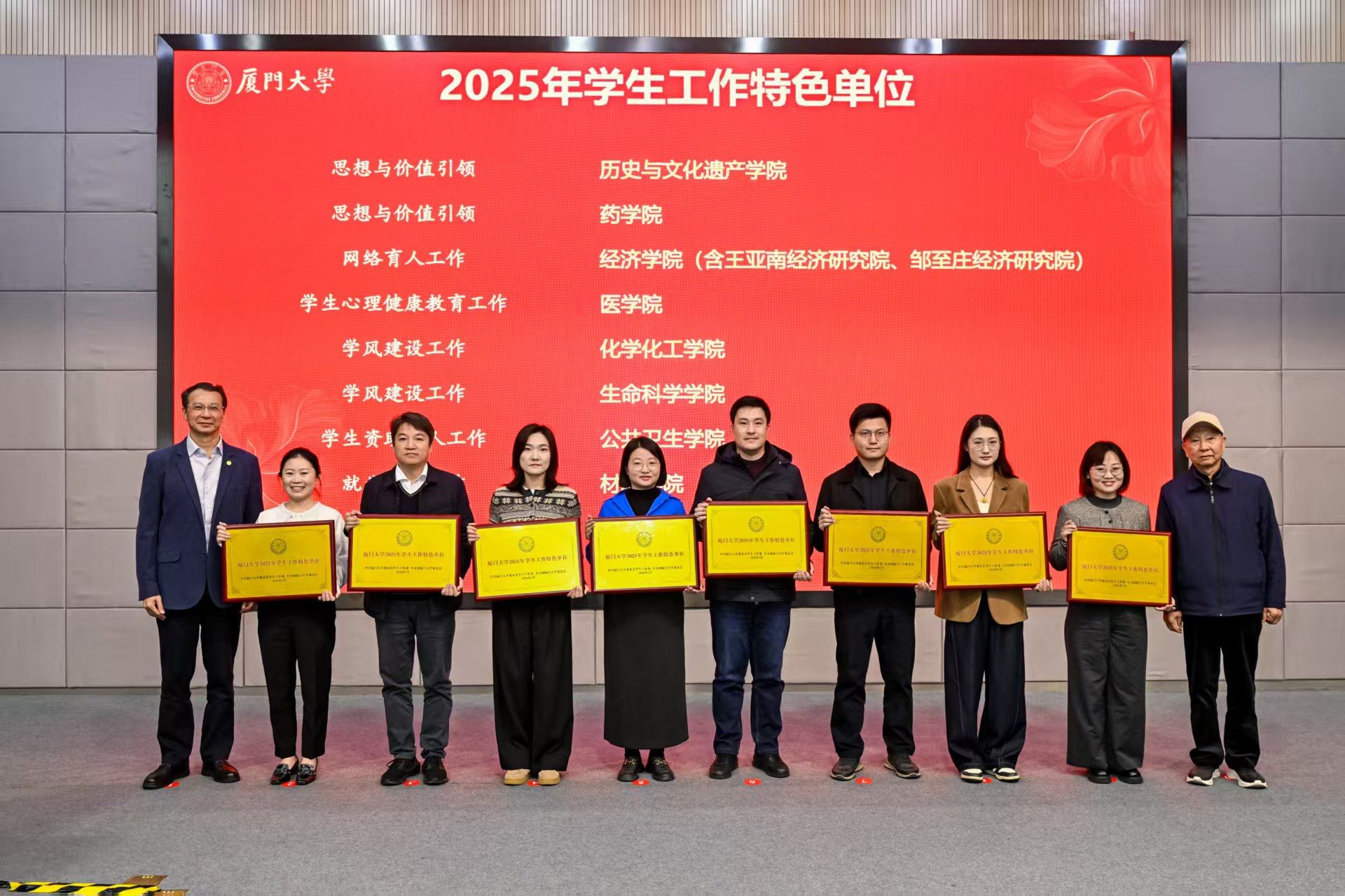 1月16日,厦门大学2025年度学生工作总结表彰大会在翔安校区德旺图书馆2号报告厅召开。会议总结了过去一年学校学生工作的有效做法与宝贵经验,并对学生工作先进单位、特色单位进行表彰。我院凭借扎实深入的资助育人工作成效,荣获“厦门大学2025年学生资助育人工作特色单位”称号,至此学院已实现学生工作连续五年获学校年度表彰——2024年获评“学生工作先进单位”、2023年获评“学生工作先进单位”、2022年获评“学生工作志愿服务工作特色单位”、2021年获评“学生工作奋进单位”,彰显了学院育人工作的持续成效与鲜明特色。学院学工组全体成员参会。