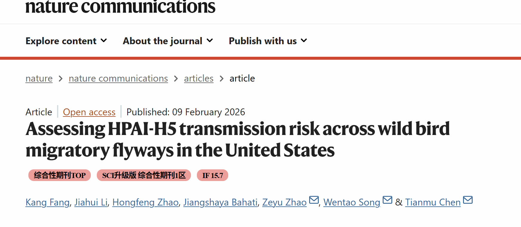 近日,我院陈田木副教授团队在高致病性禽流感(HPAI) 病毒传播动力学研究方面取得重要进展,相关研究成果以“Assessing HPAI-H5 transmission risk across wild bird migratory flyways in the United States”为题发表于国际权威学术期刊《自然·通讯》(Nature Communications)。研究聚焦 2022—2025 年美国野鸟 H5 亚型高致病性禽流感的传播过程,综合运用病毒基因组系统地理学、传播风险量化、时空聚集分析与机器学习建模,系统刻画病毒在美国四大迁飞通道(Pacific、Central、Mississippi、Atlantic)中的扩散特征与关键风险环节,通过宏观微观相结合的方式为高致病性禽流感监测预警与综合防控提供数据支撑与方法参考。