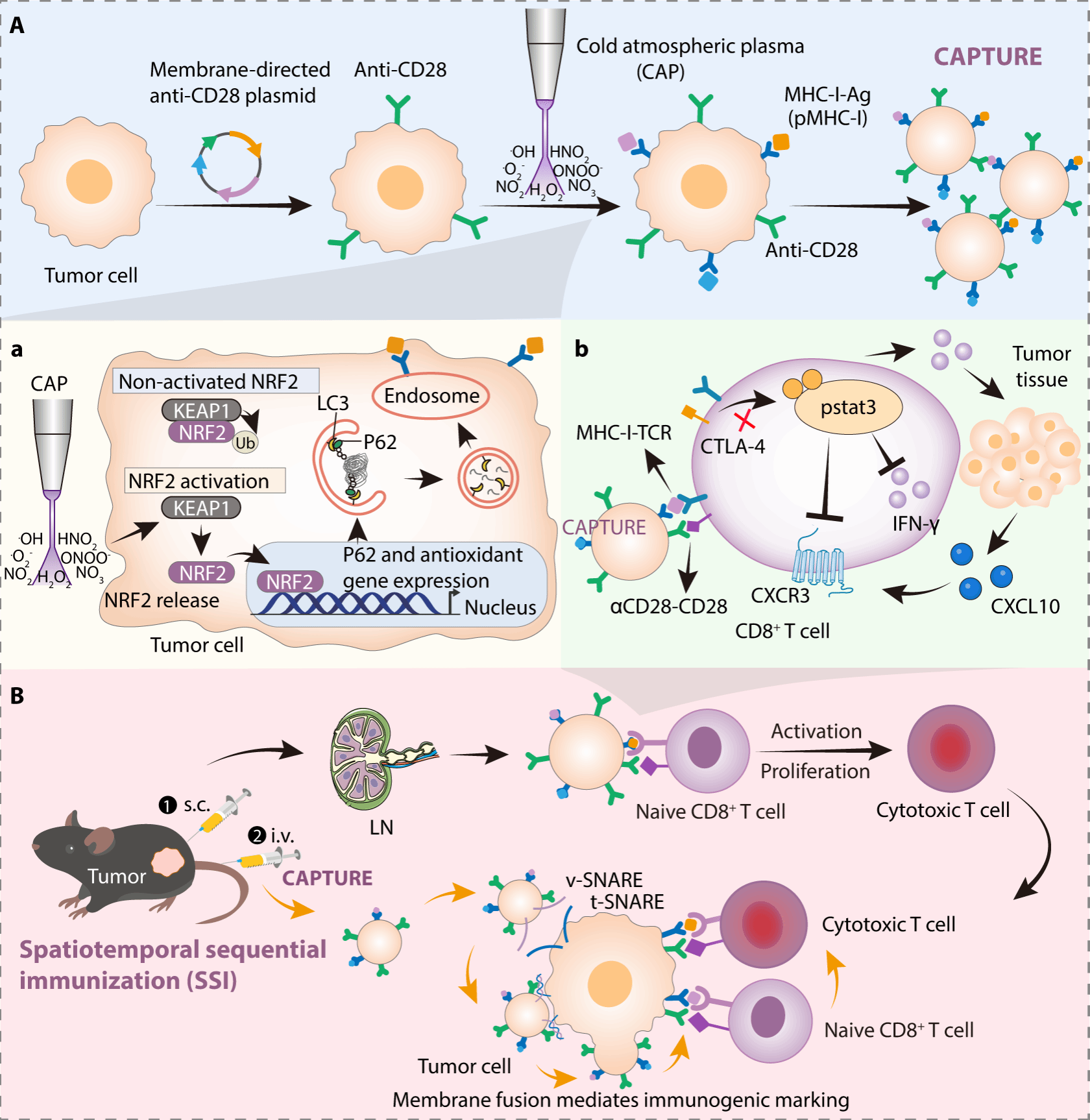 团队受冷大气等离子体(CAP)独特生物效应的启发,基于团队开发的功能化细胞膜囊泡疫苗平台(Nat Nanotechnol 2022,Angew Chem 2024, et al.),建立了一种CAP工程化肿瘤细胞衍生的免疫重编程囊泡疫苗策略(CAPTURE,图1)。经CAP处理后,肿瘤细胞发生表观重塑,通过调控p62信号通路增强自噬活性,从而介导MHC-I的表达上调及更广泛的胞内抗原的递呈,同时,CAPTURE表面基因工程修饰的抗CD28抗体可直接向T细胞提供共刺激信号。这种设计避免了对APC抗原交叉递呈的依赖,使CAPTURE能够直接激活初始CD8+T细胞,显著提高了抗原递呈和T细胞活化效率。并且,该策略绕过了经典的B7-CD28通路,从而规避B7与CTLA-4的结合导致的对T细胞的抑制效应,这一设计不仅增强了T细胞的激活强度,还上调了趋化因子受体CXCR3的表达,同时刺激肿瘤组织分泌趋化因子CXCL10,引导其高效浸润至肿瘤内部。在此作用机制基础上,团队进一步提出了一种将皮下预免(淋巴靶向)与静脉增强(肿瘤归巢)相结合的时空序贯免疫(SSI)策略,以协调系统性免疫激活和肿瘤免疫原性重塑。先通过皮下注射将CAPTURE输送至淋巴结,启动系统性T细胞激活;再通过静脉注射使其靶向肿瘤组织,利用CAP诱导表达的融合蛋白(如v-SNARE)实现与同源肿瘤细胞的高效融合,将MHC-I抗原复合物和抗CD28分子转移至肿瘤细胞表面,使其重新被T细胞识别。这一“先激活、再标记”的时空组合拳,实现了从免疫启动到效应阶段的全程放大。在多种肿瘤模型中,CAPTURE联合SSI策略通过促进T细胞浸润及克隆多样性,实现了近乎完全的肿瘤根除,其效果优于传统形式的肿瘤疫苗及免疫检查点抑制剂(抗PD-1/抗CTLA-4)。