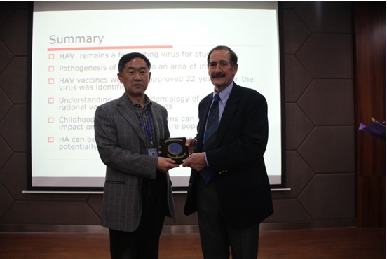 Stephen M. Feinstone博士针对“甲型肝炎的发现和控制”这一主题进行了深入讲解。他首先给出了1982—1993年急性病毒性肝炎的类型分布,并详细介绍了人类传播的相关研究和已知的两种形式的病毒性肝炎特征,这一讲述非常具有理论价值。同时,还列举了甲肝病毒感染临床、病毒学和血清学的事件,并分地区、年龄进行了详细的比较,增强了大家对甲型肝炎的理解。最后,还针对甲型肝炎的预防、甲型肝炎疫苗的原则以及甲肝病毒在细胞培养等方面,给出了相应的最优策略。在座的师生被Stephen M. Feinstone博士精彩的演讲深深吸引,积极思考,在提问环节提出了许多颇具思想深度的相关理论与实践问题,Stephen M. Feinstone博士一一给出了详尽的解答,让师生们受益匪浅。精彩的演讲在持续不断的掌声中圆满落幕。