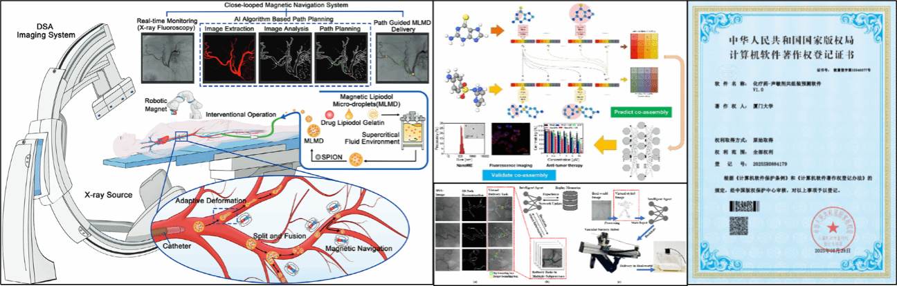 3.基于人工智能的药物共组装、递送及医疗机器人智能决策:基于深度学习的声敏剂-药物相互作用模型,用于预测药物混合物的粒径。不仅提高了预测的准确性,还可分析分子结构对预测结果的影响。首创“导丝介入虚拟到现实”的AI训练范式,让人工智能代理在高度仿真的虚拟环境中自主学习数千次手术决策,掌握从复杂血管迷宫中精准导航的“虚拟手术技能”。基于AI的多模态医学影像配准,使对应解剖结构或功能区域在空间位置上精准对齐等临床新技术的探索研发。