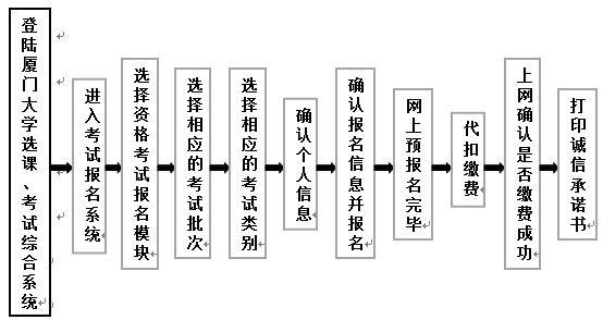 1. 请用IE浏览器(IE8或IE9)登陆厦门大学选课、考试报名综合系统(http://bkxk.xmu.edu.cn/),进入考试报名系统,选择资格考试报名模块中的相应考试批次进行报名。