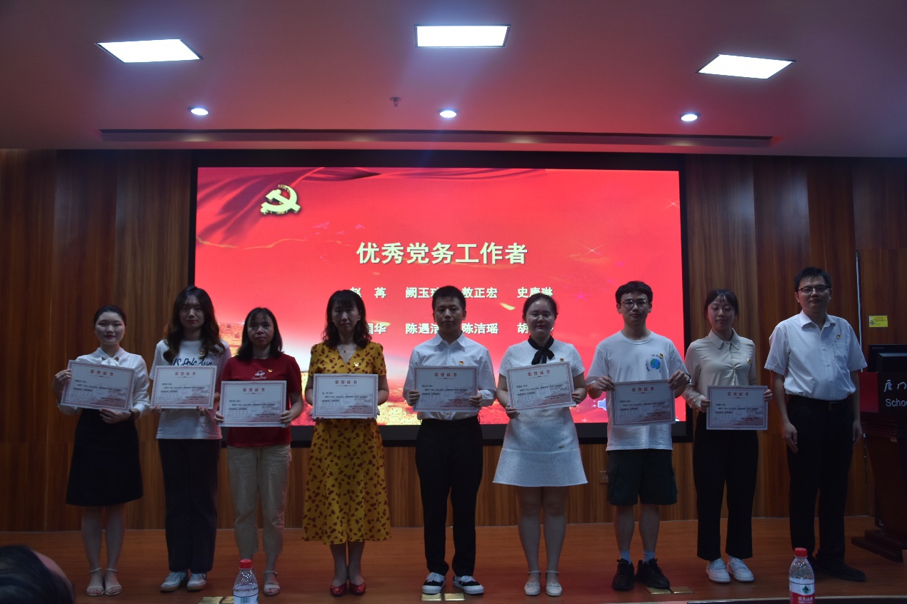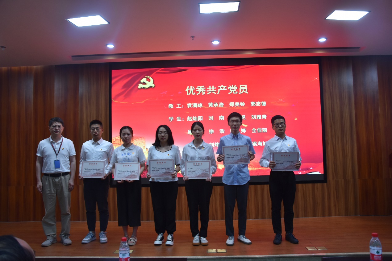 表彰大会在全场党员嘹亮的国歌歌声中开始。张琥宣读表彰决定,教工第四党支部、研究生第十党支部、本科生党支部获“先进党支部”,袁满琼、赵灿阳等16人获“优秀优秀党员”,赵苒、敖正宏等8人获“优秀党务工作者”。