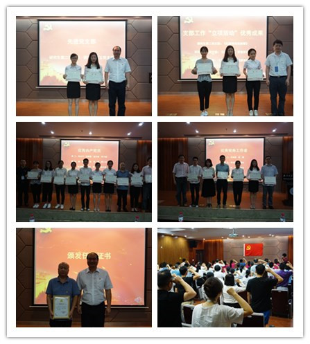 表彰大会在全场党员嘹亮的国歌歌声中开始。杨机像副书记代表院党委宣读《关于表彰2018年先进党支部、优秀共产党员、优秀党务工作者、党支部工作“立项活动”优秀成果的决定》,研究生第二党支部和研究生第五党支部获“先进党支部”,张宇斌等13人获“优秀党员”,何承勇等6人获“优秀党务工作者”,研究生第二、五、七党支部的工作立项分别获“立项活动”优秀成果。