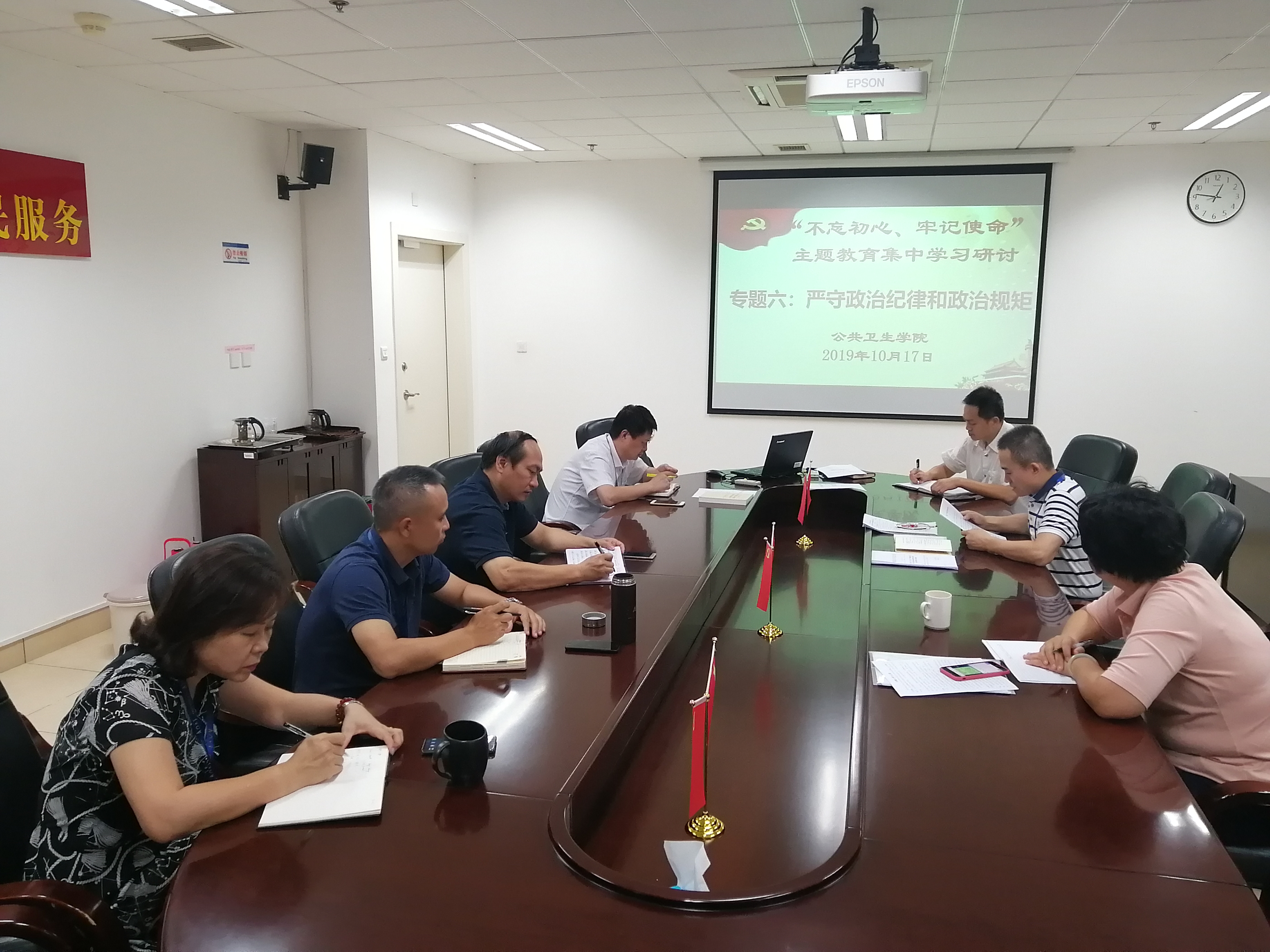 10月17日,公共卫生学院开展“不忘初心、牢记使命”主题教育集中学习研讨,主题是严守政治纪律和政治规矩。参加人员有党员领导干部、党委委员。本次集中学习研讨由院党委委员、副院长林忠宁主讲领学。