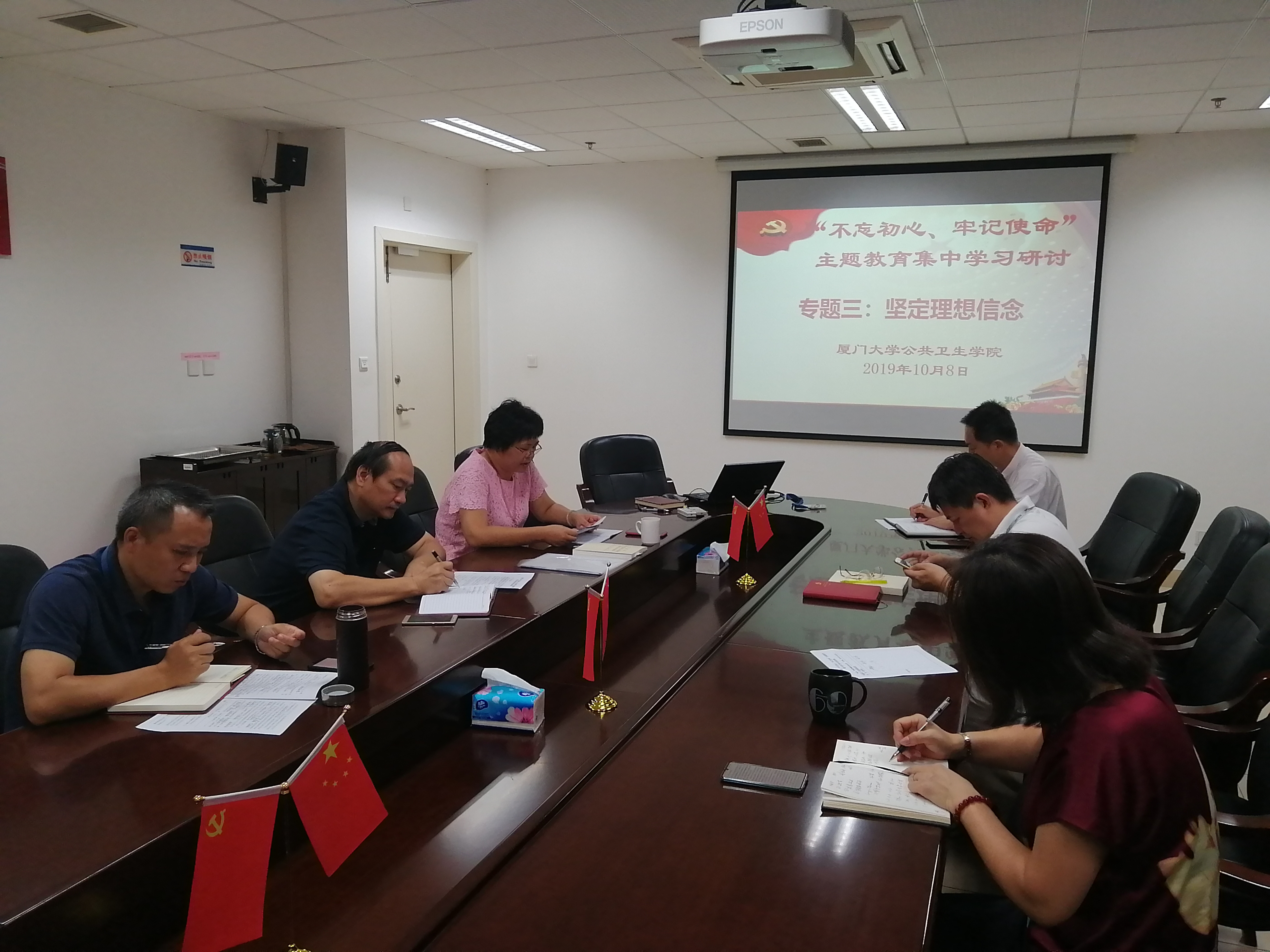 10月8日,公共卫生学院开展“不忘初心、牢记使命”主题教育集中学习研讨,主题是坚定理想信念。参加人员有党员领导干部、党委委员。本次集中学习研讨由院党委副书记黄兆君主讲。
