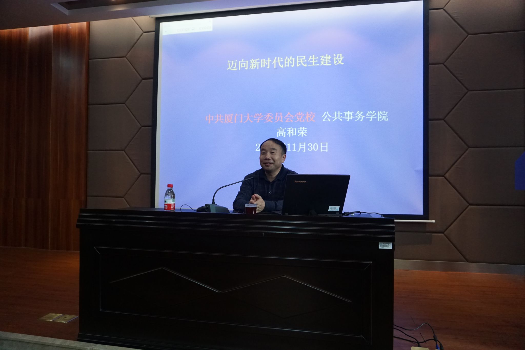 为深入学习和全面贯彻党的十九大精神,11月30日中午,学院邀请了校党委党校副校长、公共事务学院高和荣教授在曾宪梓楼101报告厅作《迈向新时代的民生建设——学习贯彻十九大精神》的报告。会议由院党委副书记黄兆君老师主持,学院领导、党支部书记、师生党员共计120余人参加了报告会。