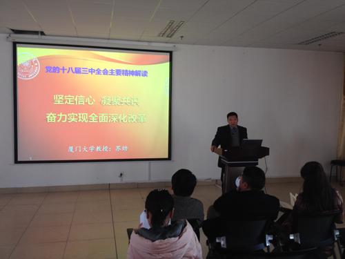 讲座中,苏劲教授指出,十八届三中全会作出了全面深化改革的决定,表明我国新一轮改革在新的历史起点上正式启动,改革的力度将是前所未有的。他运用生动的实例、丰富的资料、精辟的语言,紧密联系十八届三中全会《关于全面深化改革若干重大问题的决定》的重大思想观点、重大理论创新和重大战略部署,从“充分认识全面深化改革的重大意义,准确的把握全面深化改革的总部署”等几个方面,结合自己的理论研究,对我国未来的改革之路进行了诠释和解读。苏劲教授的报告既有理论的高度深度,又有很强的现实针对性,对更好地学习、领会、把握三中全会的精神实质,客观准确地把握全会提出的新思想、新论断、新举措,将起到重要的促进作用。
