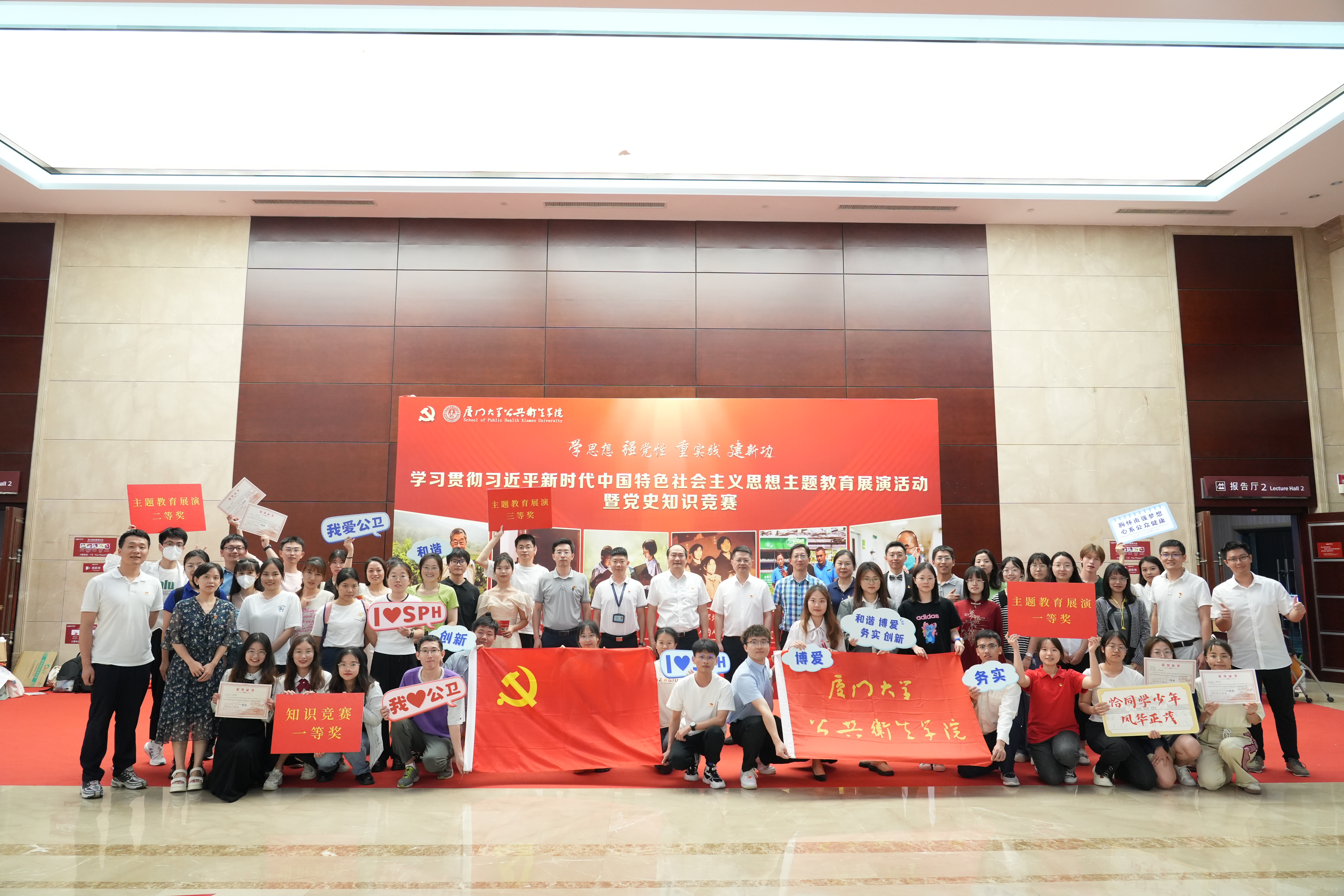 6月26日晚上,一场以“学思想、强党性、重实践、建新功”为主题的学习贯彻习近平新时代中国特色社会主义思想主题教育展演活动暨党史知识竞赛在翔安校区德旺图书馆2号报告厅拉开帷幕。翔安校区学生办公室主任、校主题教育第七巡回指导组副组长高斌,翔安校区办公室主任、校主题教育第七巡回指导组副组长薛志平,学院党委书记张琥,院长张军,党委副书记蒲晓业,党委委员、预防医学系主任方亚及200多名师生党员、入党积极分子参与此次活动。