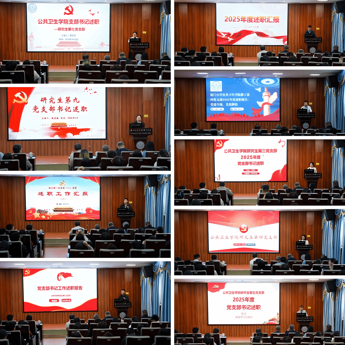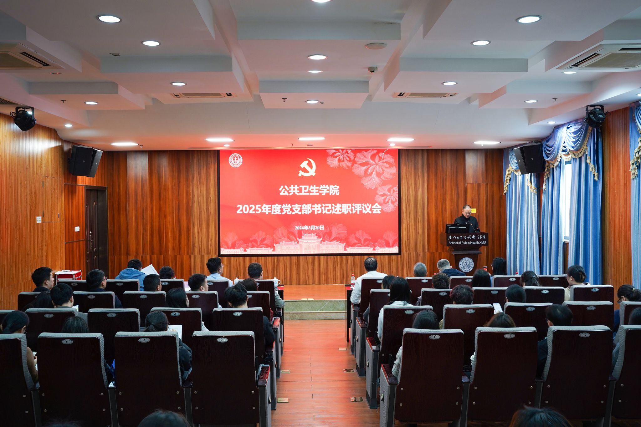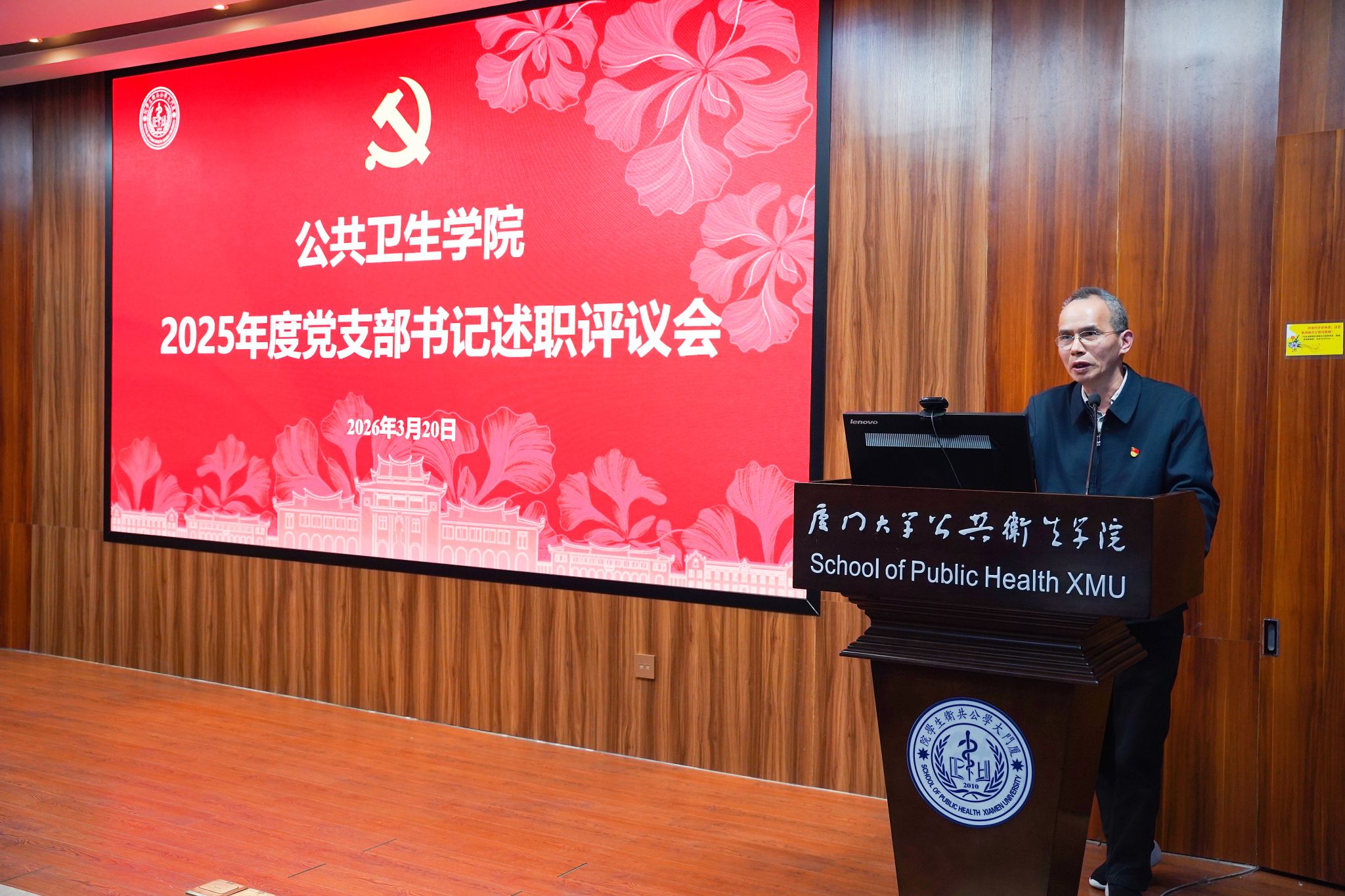 为压实基层党支部的党建主体责任,推动全面从严治党向基层延伸,提升基层党建工作质量,3月20日,公共卫生学院在曾宪梓楼101报告厅召开2025年度党支部书记述职评议会。学校基层党建联络员侯利标、翔安校区学生办公室主任林明华,学院党政领导班子、党委委员、辅导员及各党支部书记、支委参加会议。会议由院党委副书记刘君彬主持。