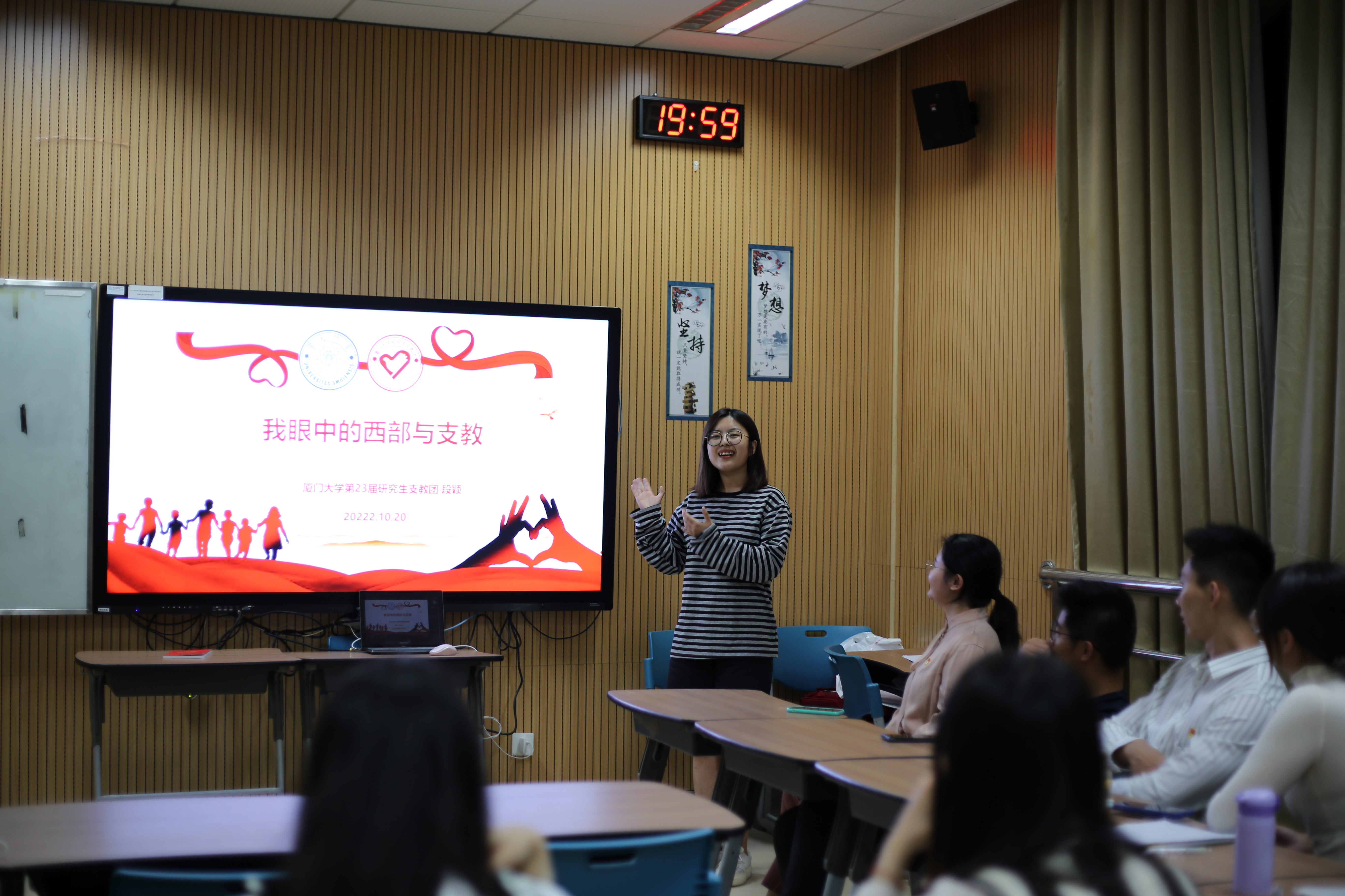 10月20日晚,为深入学习贯彻习近平新时代中国特色社会主义思想,认真学习贯彻习近平总书记在福建工作时的重要理念和重大实践,了解闽宁教育帮扶的动人历程与背后故事,研究生第十党支部组织开展“闽山闽水物华新”“固定党日+”活动,党支部全体党员及发展对象一同观看了纪录片《闽宁纪事2022·爱在山那边》,并邀请了厦门大学第23届研究生支教团志愿者段颖为大家分享她眼中的西部与支教。