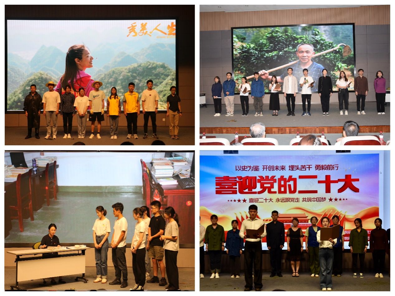 活动进入第三个篇章《愿以寸心寄华夏,且将岁月赠山河》,各支部用精彩的表演向扎根一线,用青春和汗水践行着实干报国、忠诚奉献的誓言英雄人物致敬。桂孟铉老师和研究生第一党支部讲述了“时代楷模”黄文秀的故事;袁满琼老师和研究生第六党支部带大家重温了“最美乡村教师”张桂梅投身乡村教育、帮助1800多名贫困女孩走出大山的伟大功绩;沈淑丹老师和研究生第八党支部再现了“当代愚公”毛相林带领村民在悬崖上凿出了一条“绝壁天路”的传奇故事;薛云新老师和研究生第七党支部则展现了“草鞋书记”杨善洲“只要生命不结束,服务人民就不停止”的伟大精神。