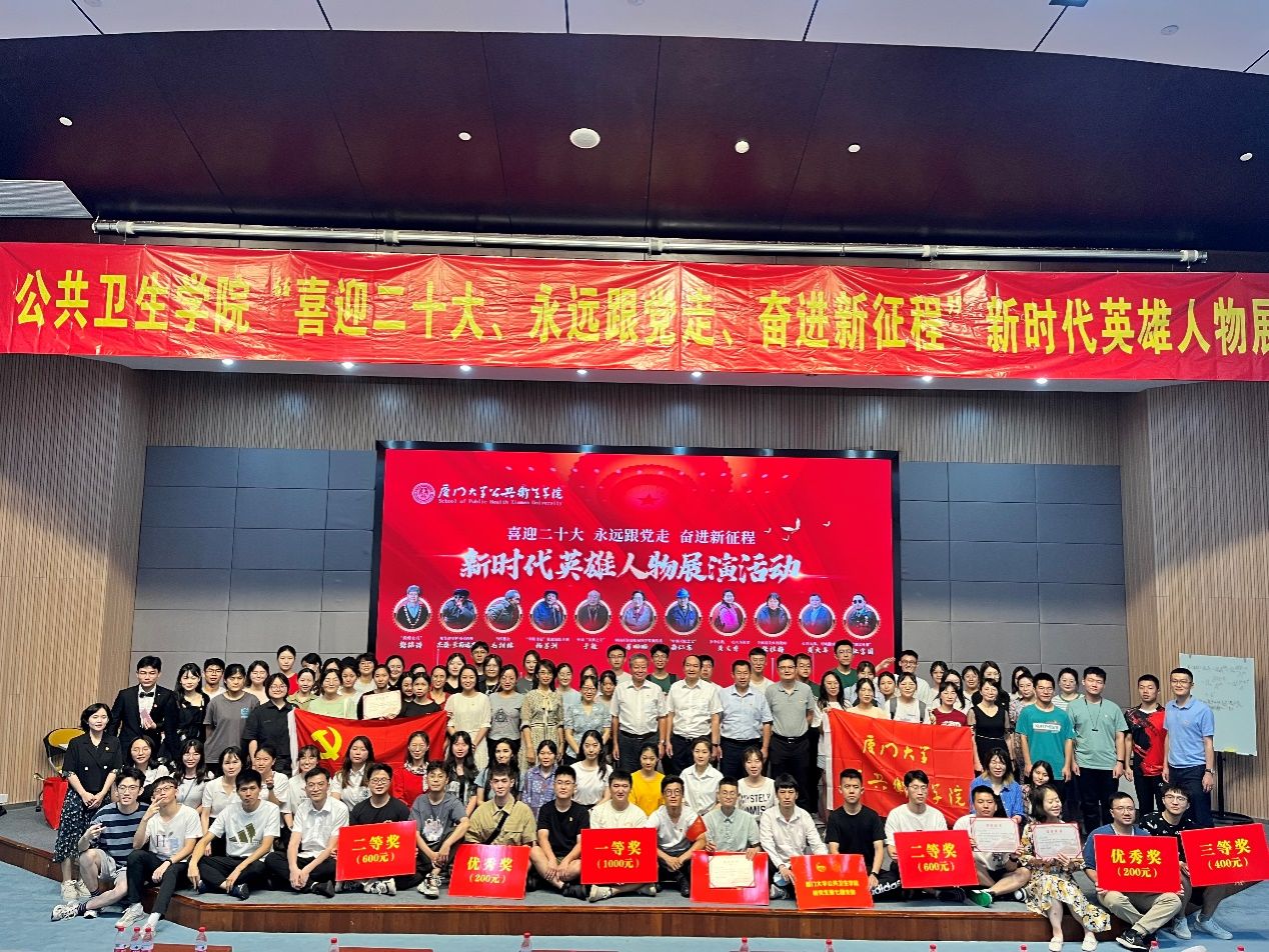 为引领广大师生永远跟党走,奋进新征程,以实际行动迎接党的二十大胜利召开,6月21日晚,公共卫生学院在德旺图书馆2号报告厅开展“喜迎二十大、永远跟党走、奋进新征程”新时代英雄人物展演活动。厦门大学党建工作联络员黄田,组织部副部长、党的建设办公室主任廖志丹,翔安校区管委会副主任马龙,学院党委领导和师生党员共同参与本次活动。