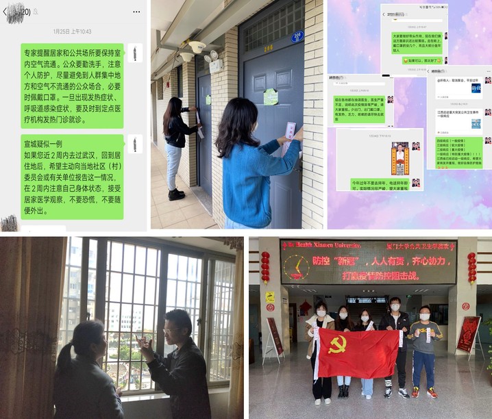疫情防控期间,支部党员积极响应学校“守望相助、共克时艰”募捐倡议,支部21名党员全部踊跃捐款,捐献一份爱心、贡献一份力量,用力所能及的方式表达对战斗在最前线的医务工作者的崇高敬意;党员赵泽宇、芮佳、徐静文主动提早返校参与新冠病毒流行病学预测模型及风险评估研究,该项研究获盖茨基金会捐赠;党员张璋主动参加翔安校区校园公交体温测量志愿者;党员赵泽宇、芮佳、徐静文、张璋主动参加学生宿舍区域疫情防控志愿服务工作;积极分子徐嵩主动报名所在社区志愿者,为小区居家隔离的邻居们送菜、在小区出入口协助测量体温登记进出人员信息、帮助社区人员消毒公共区域,为防疫工作献出一己之力;积极分子李贤积极搜集整理相关公众心理健康资料,开展疫情防护科普。